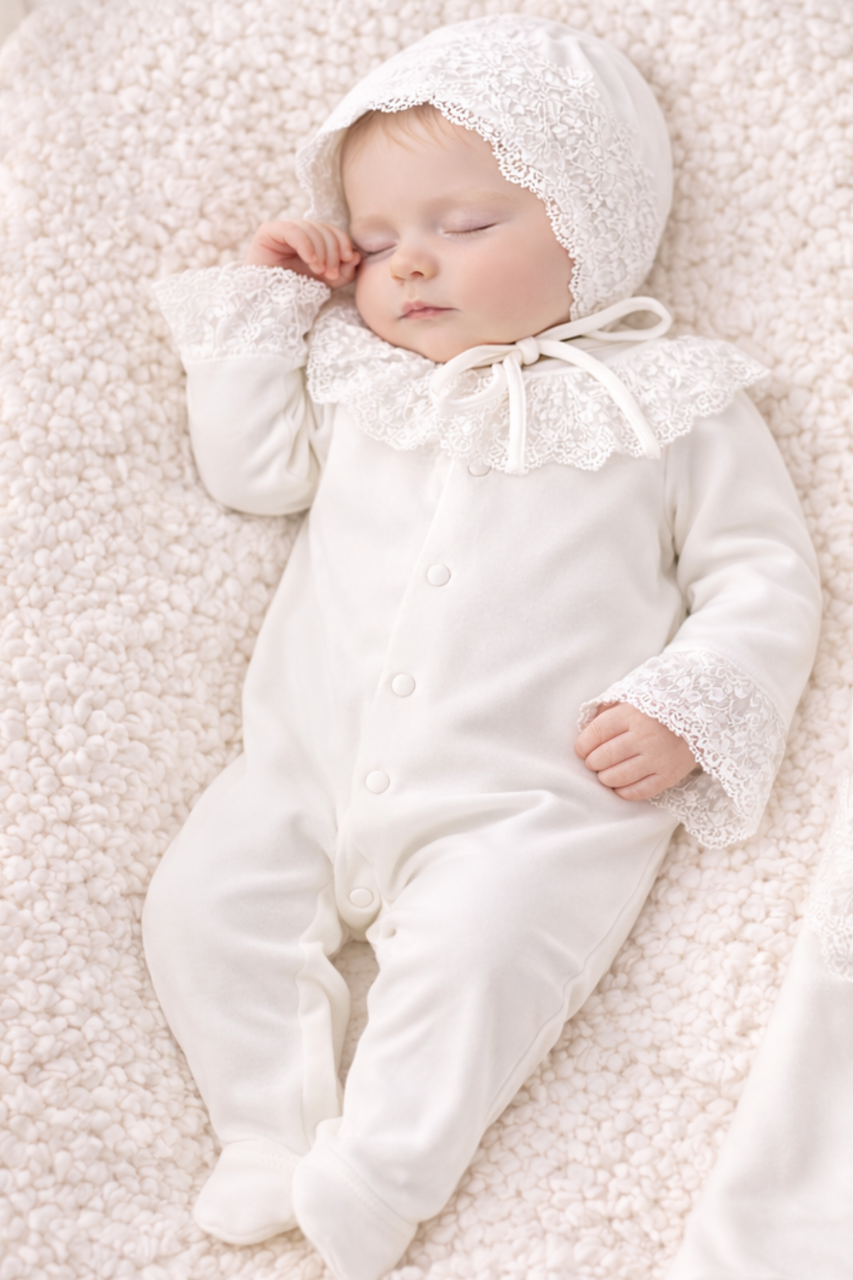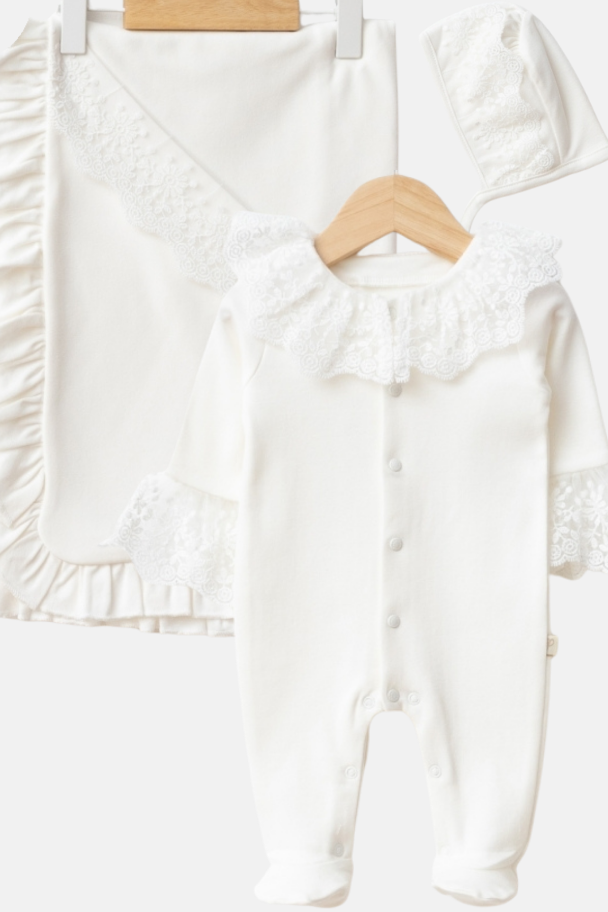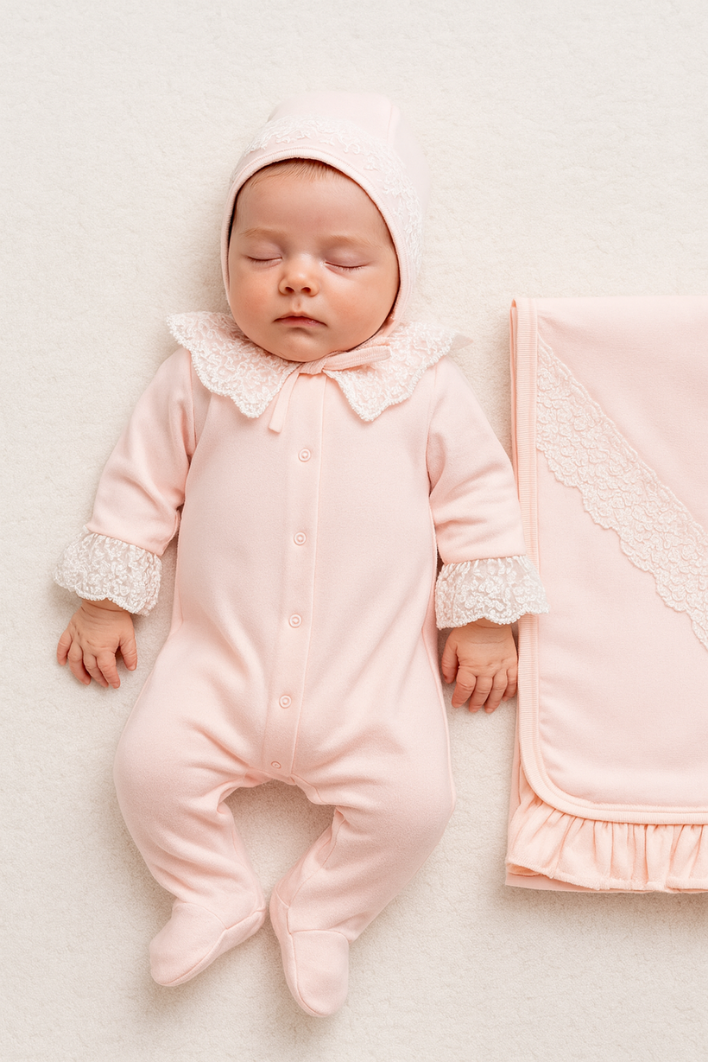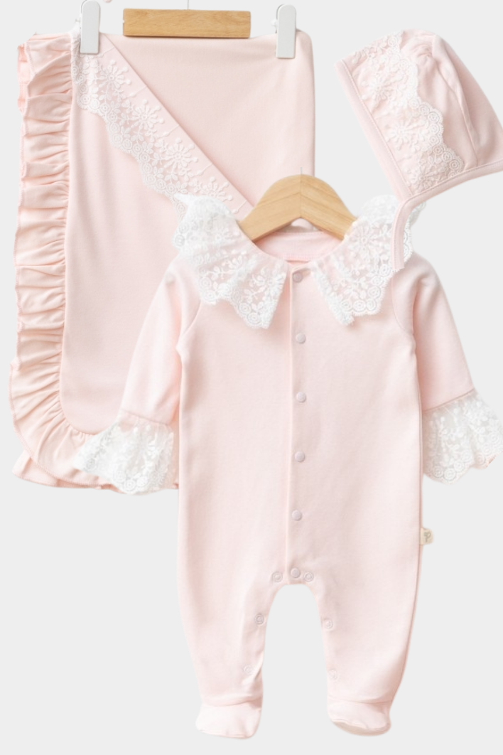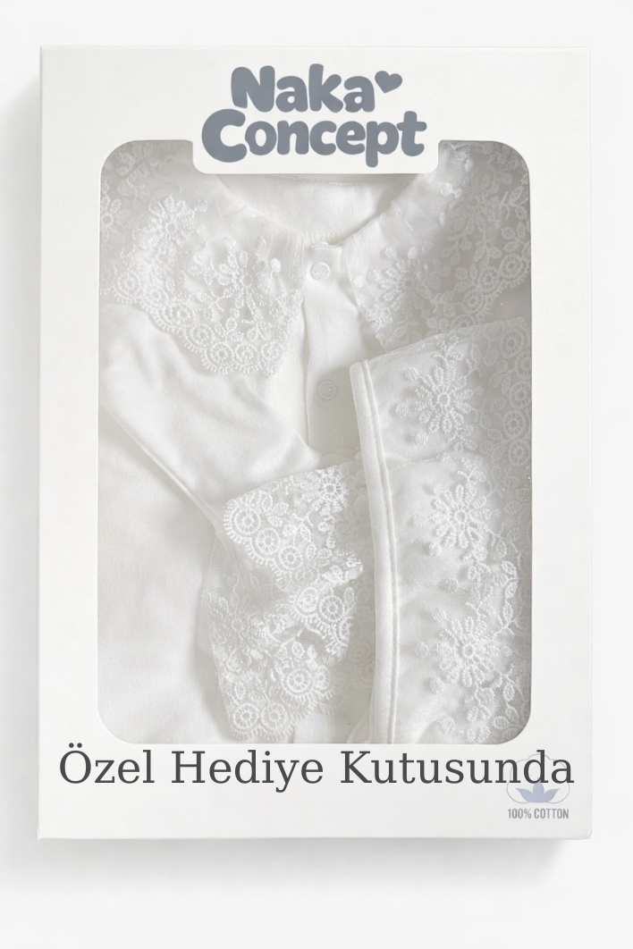 %100 doğal pamuk kumaşı ve zarif dantel detayları ile tasarlanan bu özel set, yenidoğan döneminde maksimum konfor ve sade şıklık sunar.