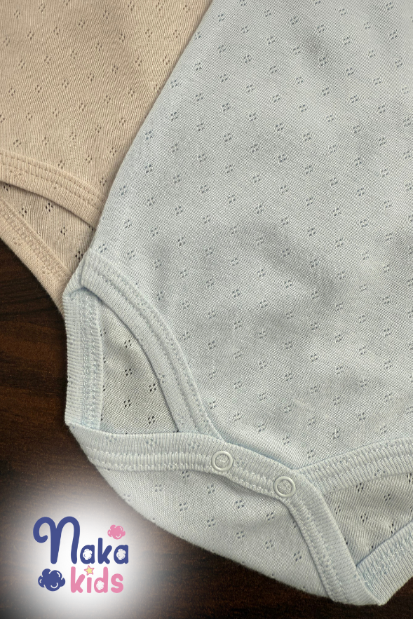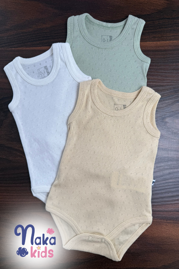 Yeşil, beyaz ve bej tonlarından oluşan bu sade ama şık zıbınlar, alttan çıtçıtlı ve kolsuz tasarımıyla pratik kullanım sunar. Kendinden delikli yapısı sayesinde bebeğinizin cildi gün boyu ferah kalır.