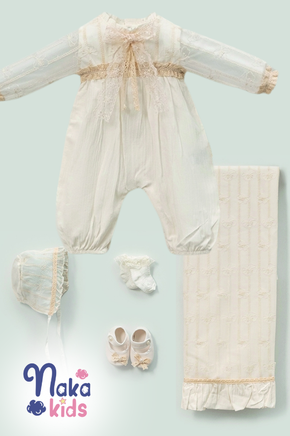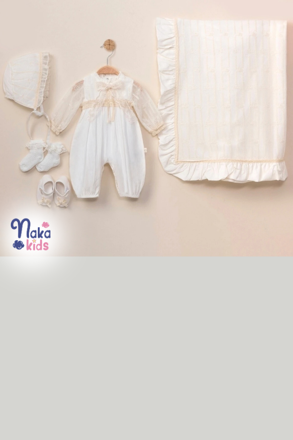 Bu şık 5 parçalık hastane çıkış seti, bebeğinizin ilk günleri için hem konforlu hem de göz alıcı bir seçenek. Her parçasında özenle yer verilen dantel detayları ile klasik ve romantik bir görünüm sunar. Özellikle müslin kumaştan üretilmiş tulumun ön kısmındaki dantel fiyonk, sete zarif bir odak noktası kazandırır.