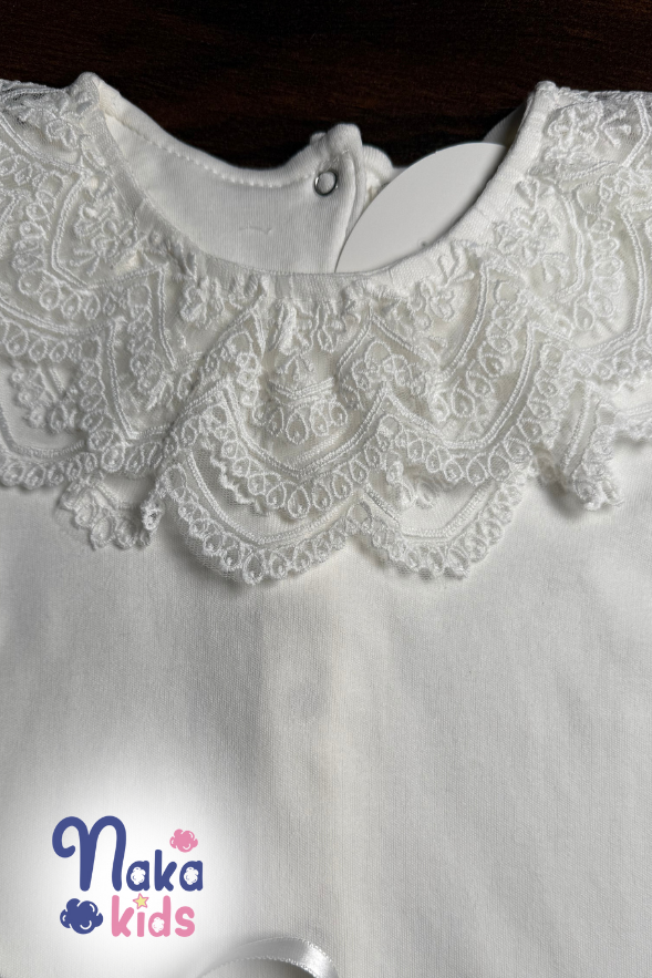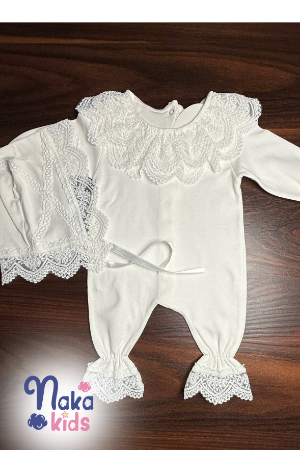 Bebeğinizin narin tenine uygun, yumuşacık dokusuyla özel tasarlanan beyaz dantel yaka tulum ve dantelli şapka seti, zarafeti ve konforu bir arada sunar.