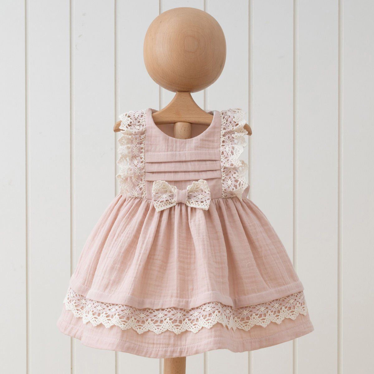 Göbeğinde yer alan sevimli fiyonk detayı, bu zarif parçaya tatlı bir dokunuş katarken, elbisenin genel estetiğini de tamamlar. Arka kısmındaki düğmeler sayesinde elbise, giydirilip çıkarılması kolay bir tasarıma sahiptir, böylece annelerin işini kolaylaştırır.