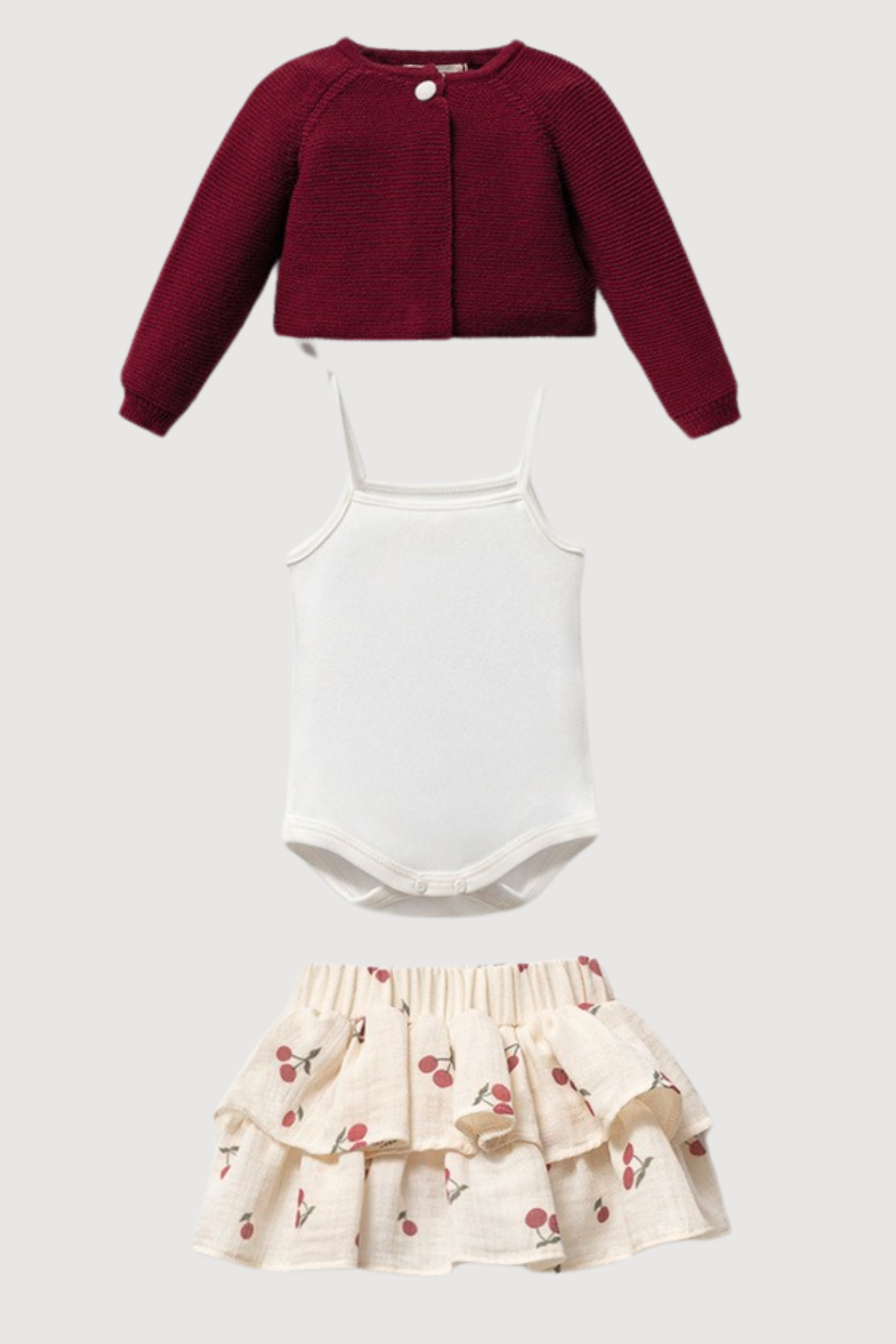 - 3 parçadan oluşan set, bebeğinizin hem rahat hem de şık görünmesini sağlar. - Kiraz desenleriyle süslenmiş tasarımı, kız bebeklerin neşeli ve tatlı görünümünü tamamlar. - Farklı yaş gruplarına uygun olarak üretilmiş olup, bebeğinizin büyüme dönemlerine uyum sağlar. - Kaliteli materyalden üretilmiş olup, bebeğinizin cildine zarar vermez ve uzun süreli kullanım için idealdir.