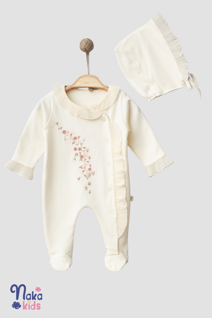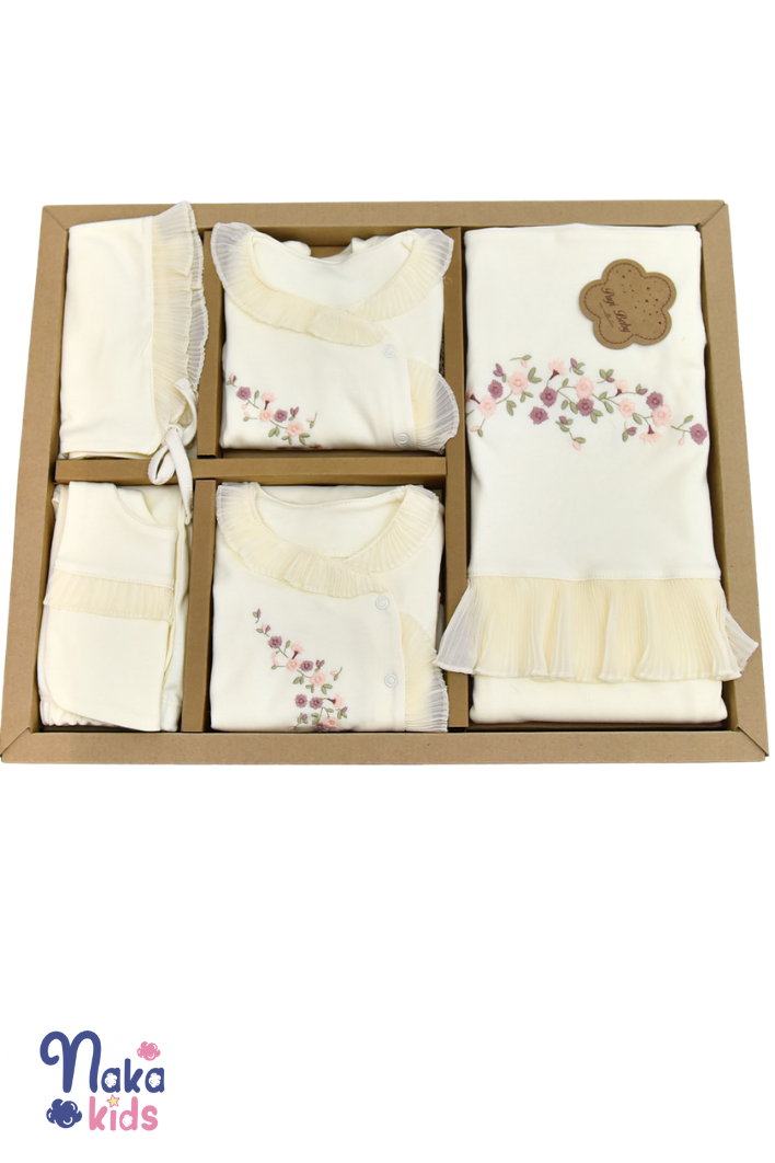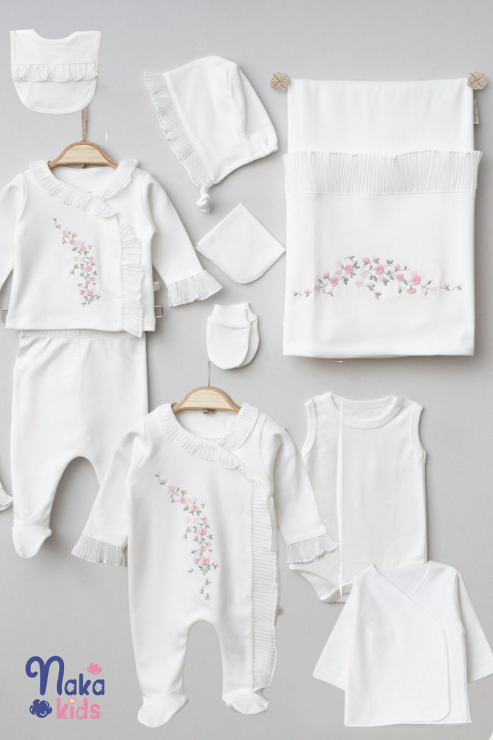 Set, zarif çiçek nakış işlemeleri ile süslenmiştir ki bu detaylar, seti hem sade hem de şık bir hale getirir. Yeni doğan bebeğinizin cildine zarar vermeden onu sıcak ve konforlu tutmak için tasarlanmış bu set, hastane çıkışından itibaren kullanıma uygundur.