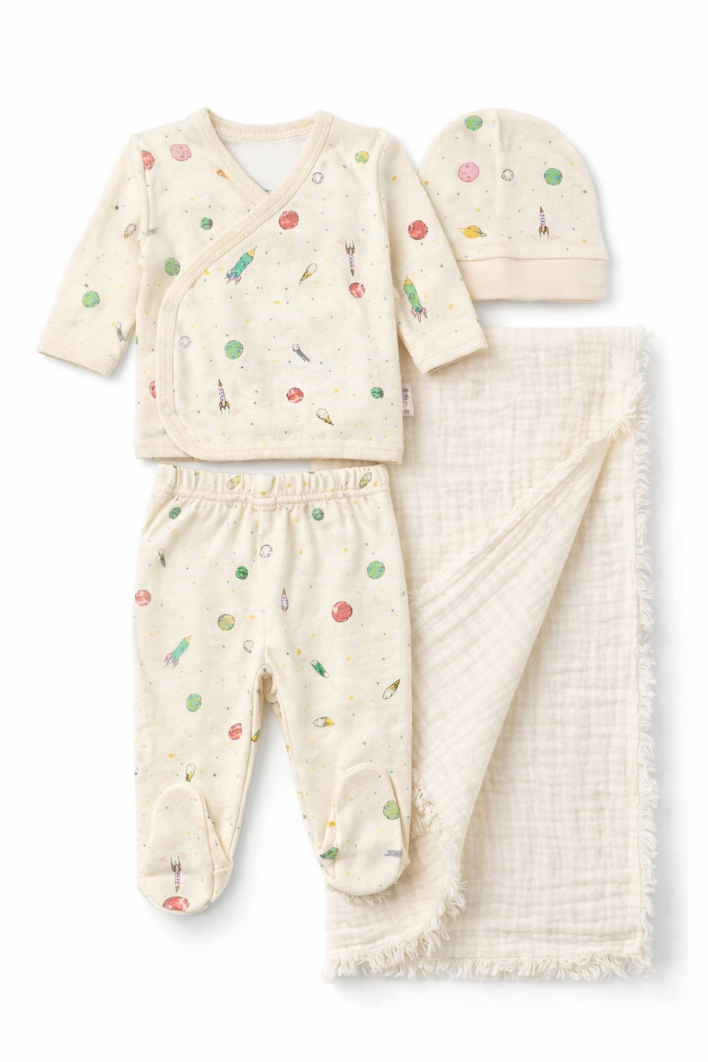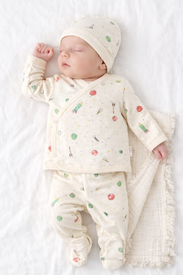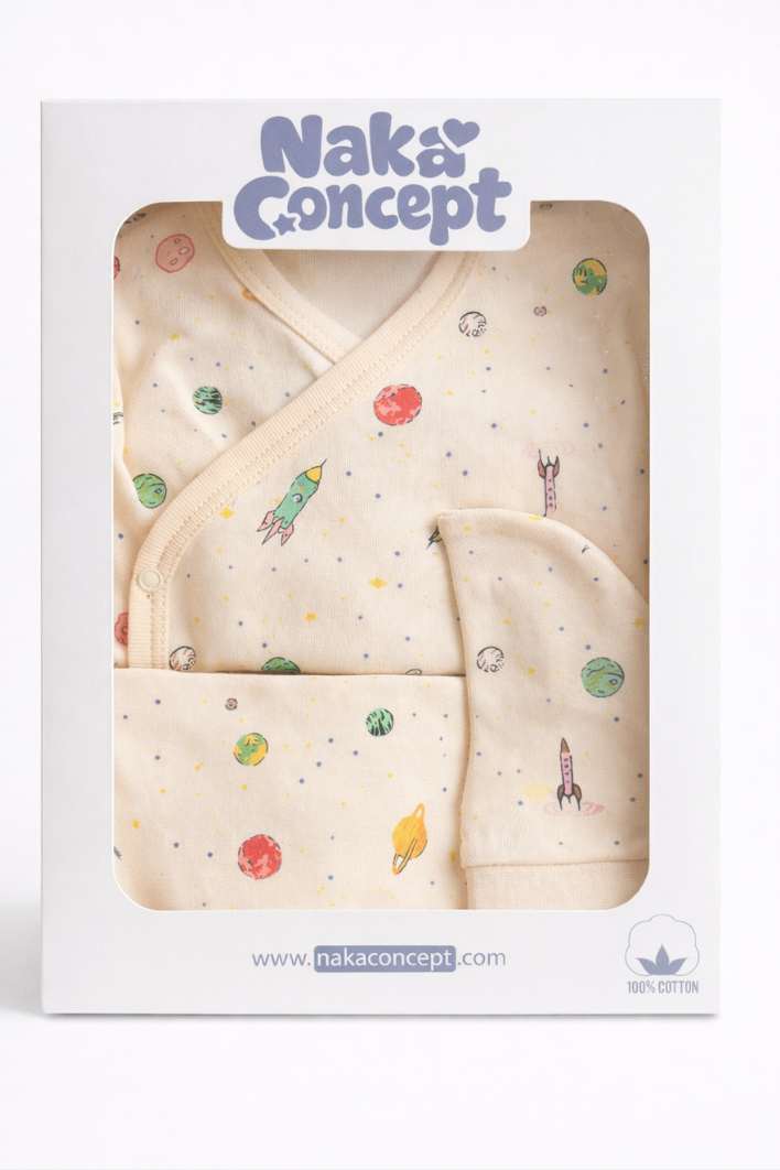 Renkli gezegen desenleriyle tasarlanmış bu özel yenidoğan set, bebeğinizin ilk günlerinde konfor ve şıklığı bir arada sunar.