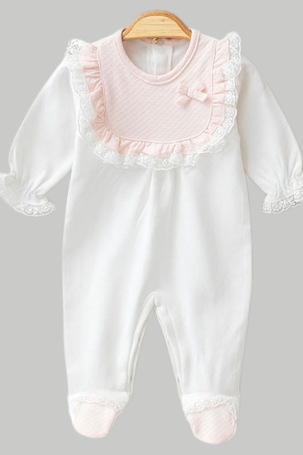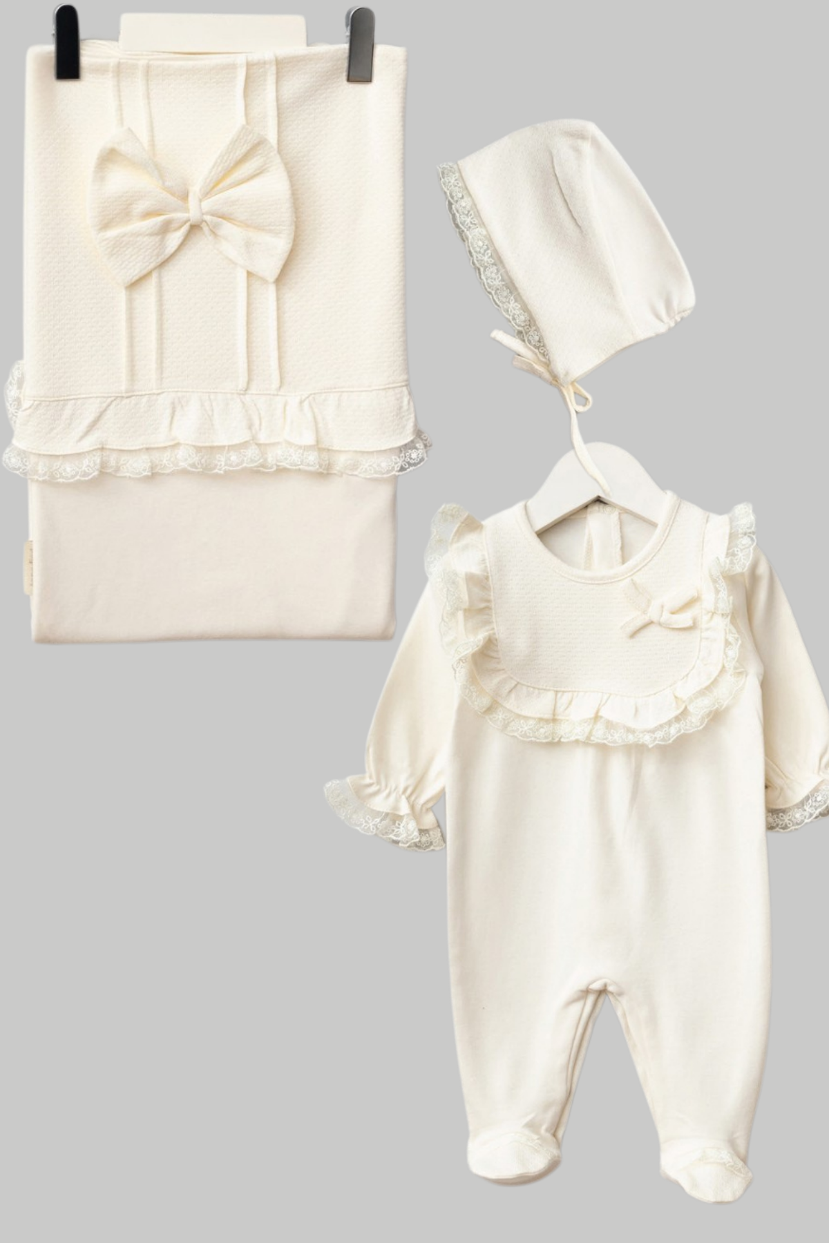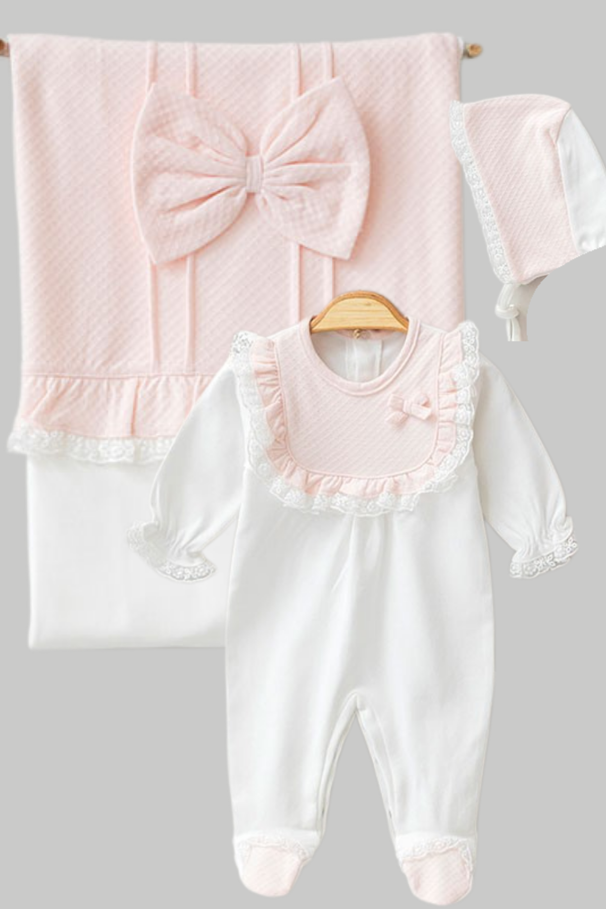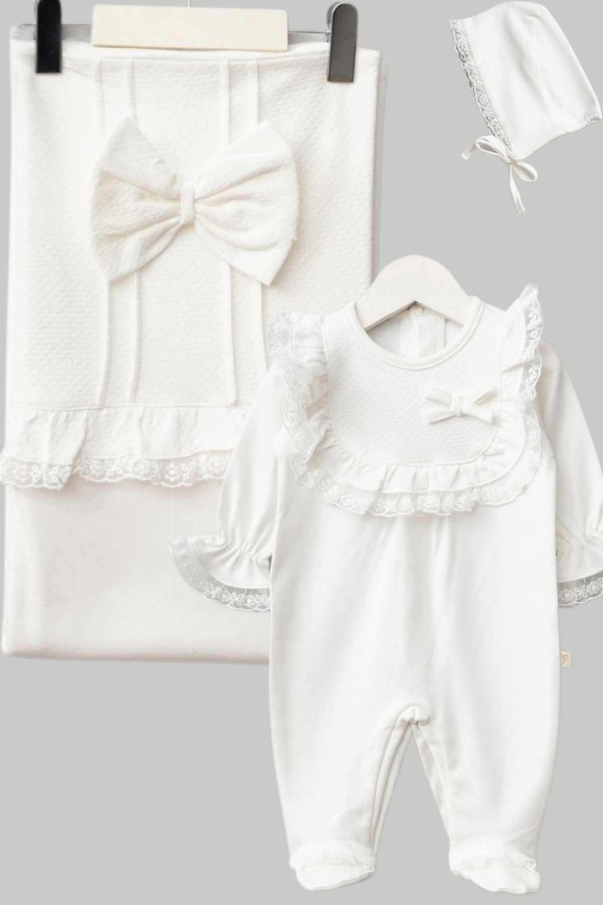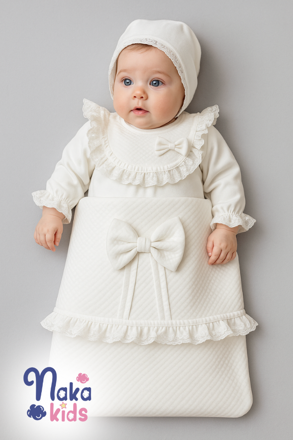 Düz renkli, %100 pamuklu kumaşıyla konfor sunarken; dantel ve fiyonk detaylarıyla şıklığı öne çıkarır. 3 parçalık bu set, doğum sonrası özel anlara anlam katar.