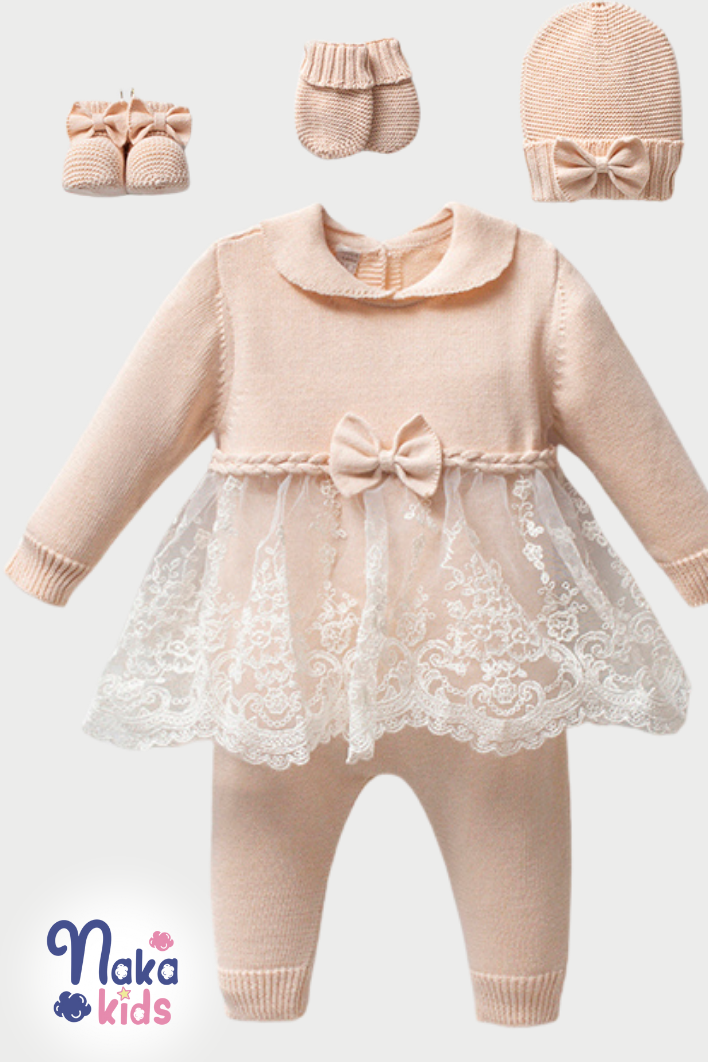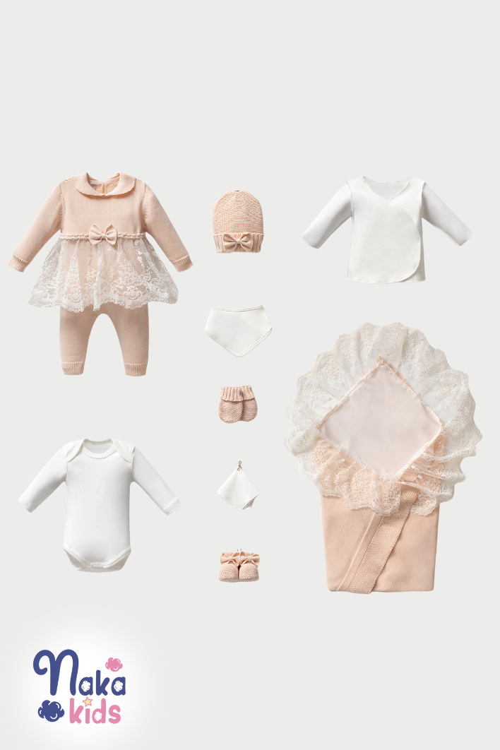 Dantelli Tüllü 10’lu Kız Bebek Hastane Çıkış Seti – Bej