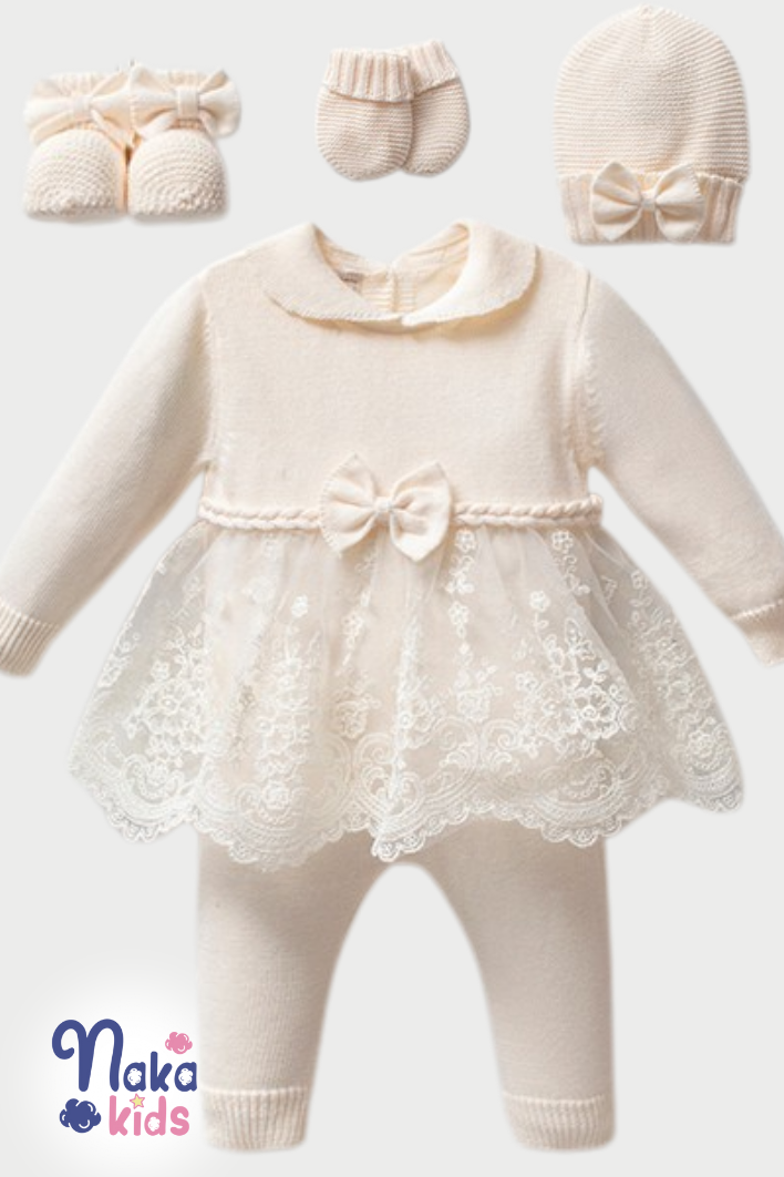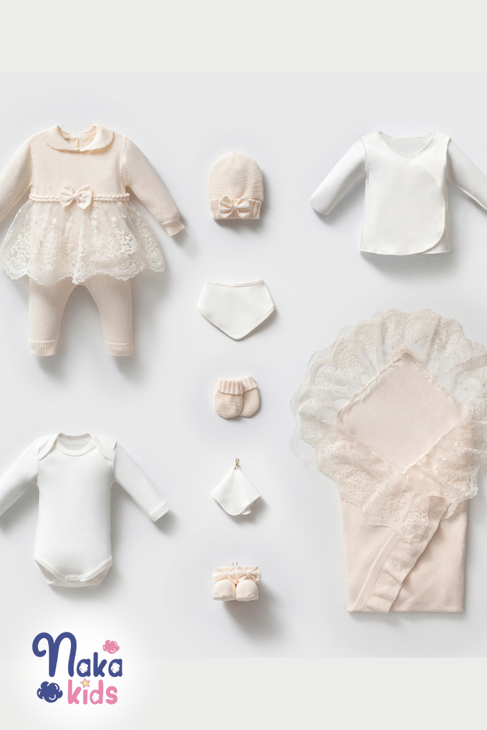 Dantelli Tüllü 10’lu Kız Bebek Hastane Çıkış Seti – Krem