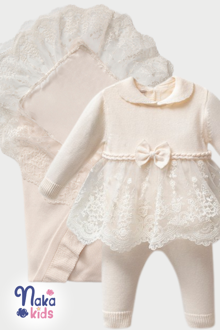 Bebeğinizin ilk günlerinde zarif bir görünüm ve konforu bir araya getiren bu özel set, dantel ve tül detaylarıyla şık, %100 pamuklu kumaşıyla ise yenidoğan cildine nazik bir dokunuş sunar. Nefes alan ve terletmeyen yapısı sayesinde bebeğinizin ilk günlerinden itibaren güvenle kullanılabilir.