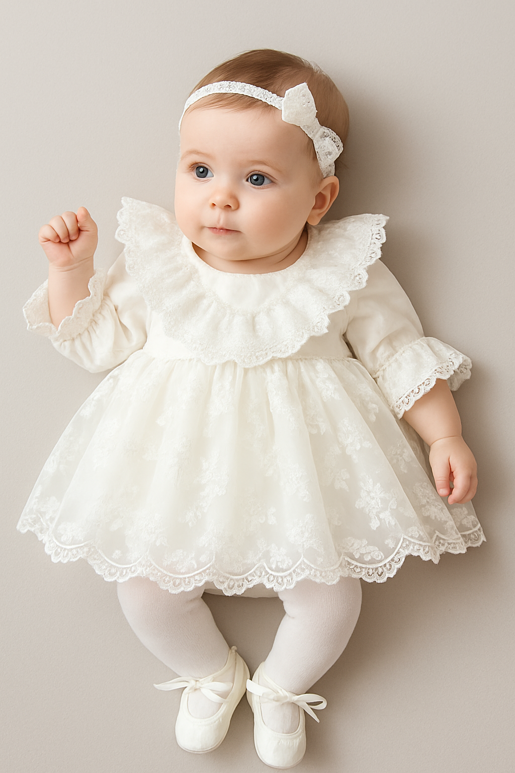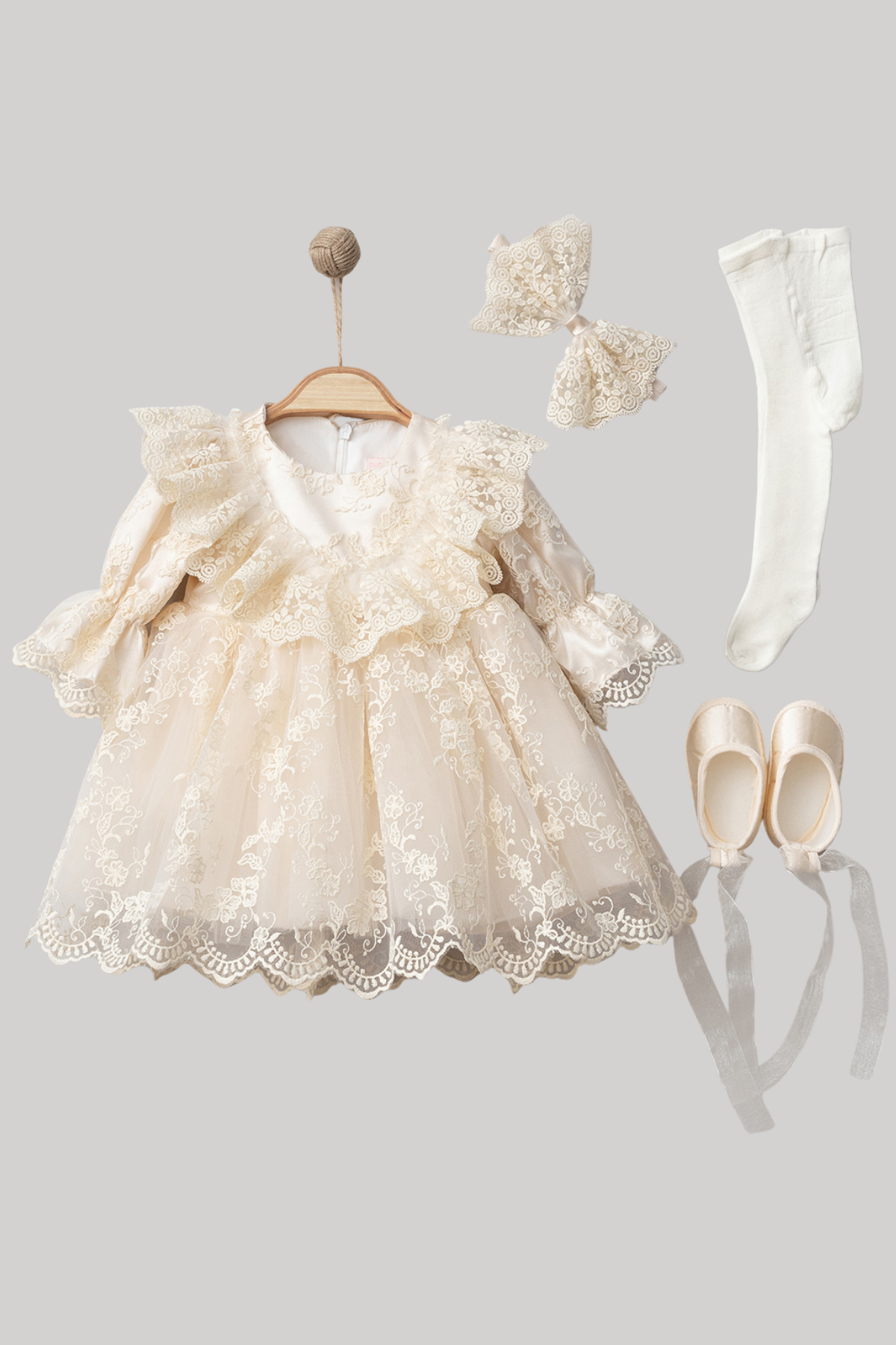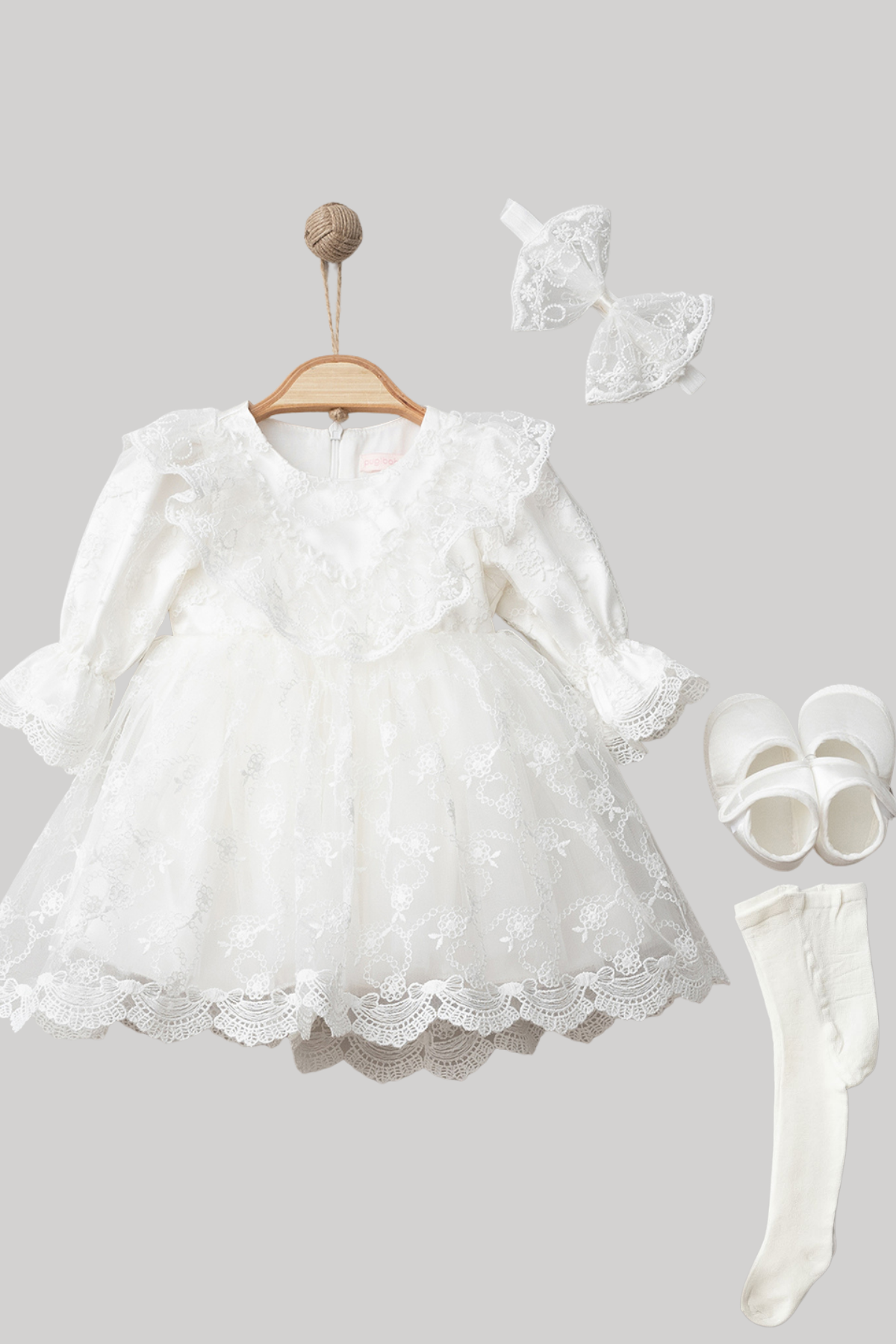 Setin merkezinde yer alan dantel detaylı elbise, %100 pamuk astarı sayesinde bebeğinizin narin cildine dosttur. Hafif yapısıyla terletmez, rahatsız etmez. Üst kısmındaki ince tül ve zarif dantel işlemeler, bu elbiseyi özel günler için mükemmel bir tercihe dönüştürür. Doğum günü, baby shower, fotoğraf çekimi veya hastane çıkışı gibi özel anlar için idealdir.