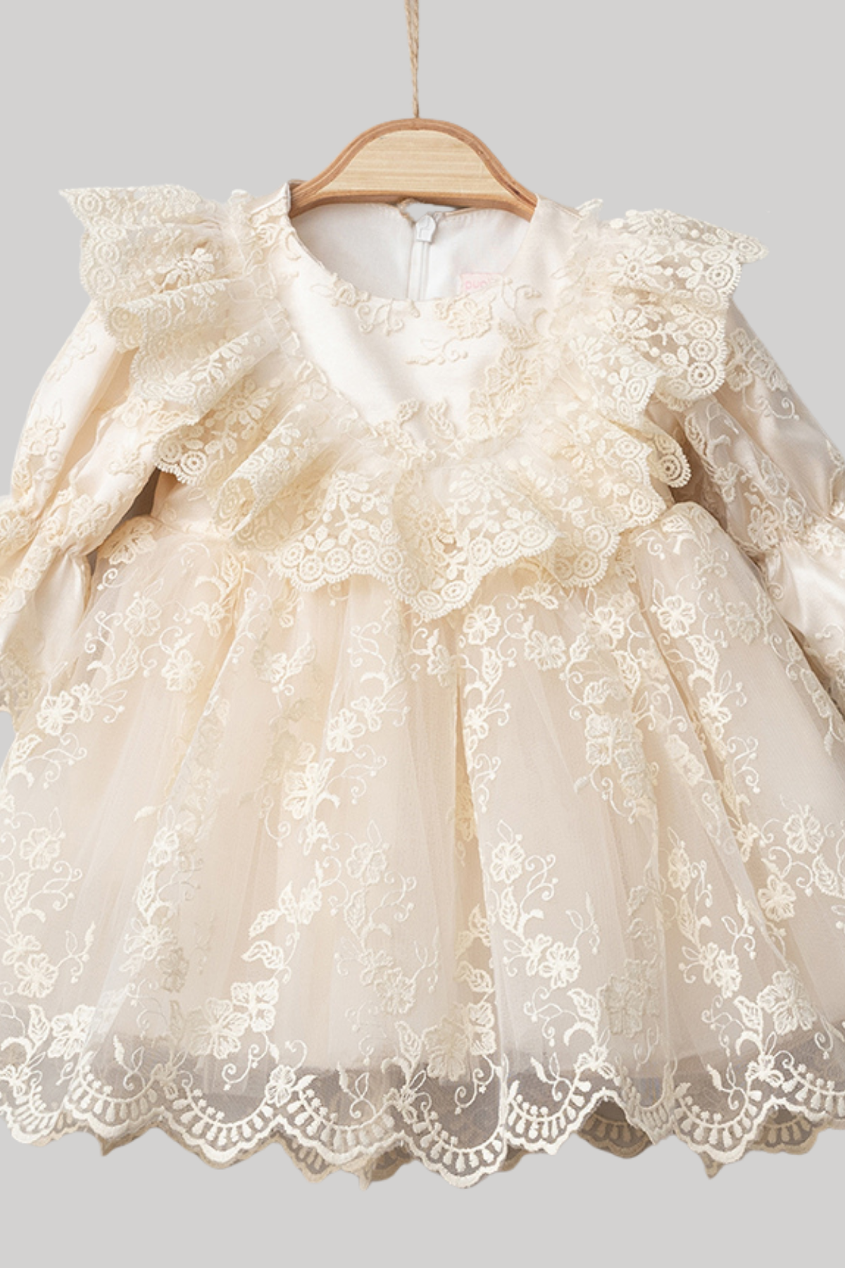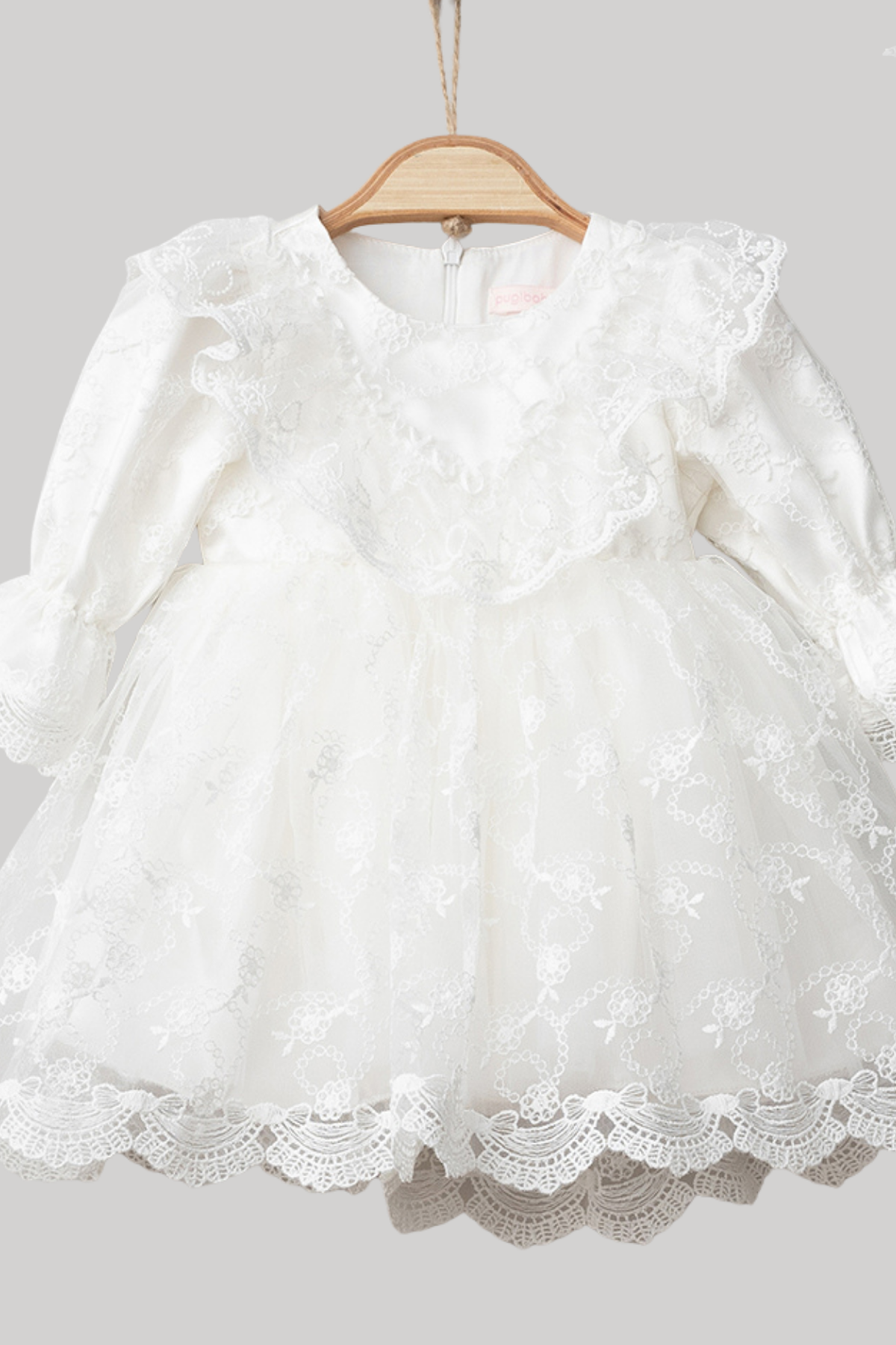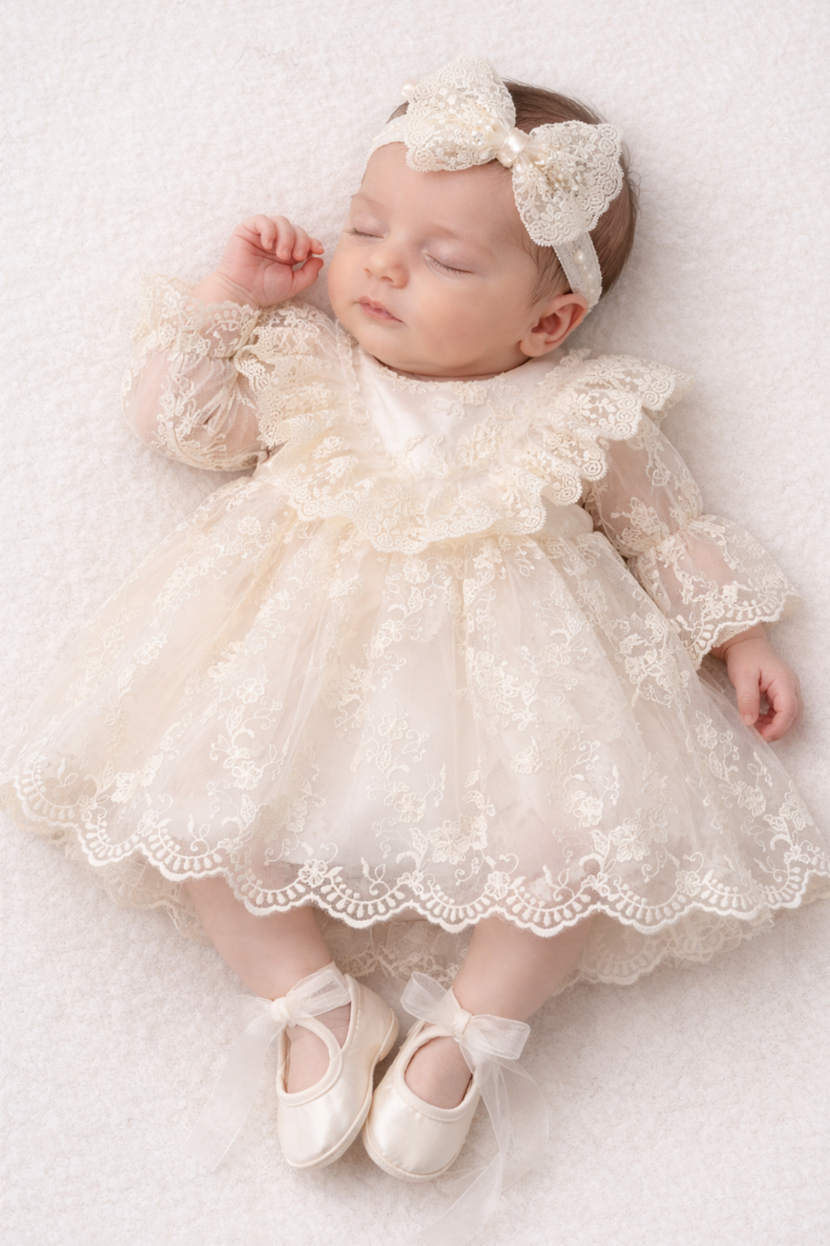 Setin merkezinde yer alan dantel detaylı elbise, %100 pamuk astarı sayesinde bebeğinizin narin cildine dosttur. Hafif yapısıyla terletmez, rahatsız etmez. Üst kısmındaki ince tül ve zarif dantel işlemeler, bu elbiseyi özel günler için mükemmel bir tercihe dönüştürür. Doğum günü, baby shower, fotoğraf çekimi veya hastane çıkışı gibi özel anlar için idealdir.