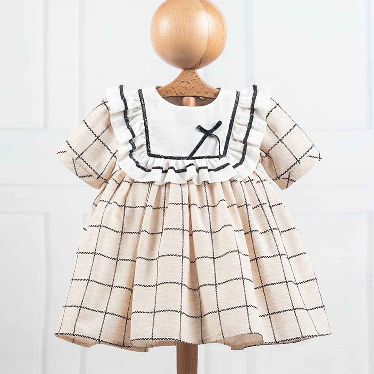 Zarif ekose deseni ve fırfır detaylı yakası ile dikkat çeken bu elbise, gündelik kullanımdan özel günlerinize kadar her ortama uyum sağlar. Elbisenin sırt kısmındaki düğmeler, giydirme ve çıkarmanın kolay olmasını sağlar, böylece ebeveynler için pratik bir kullanım sunar.