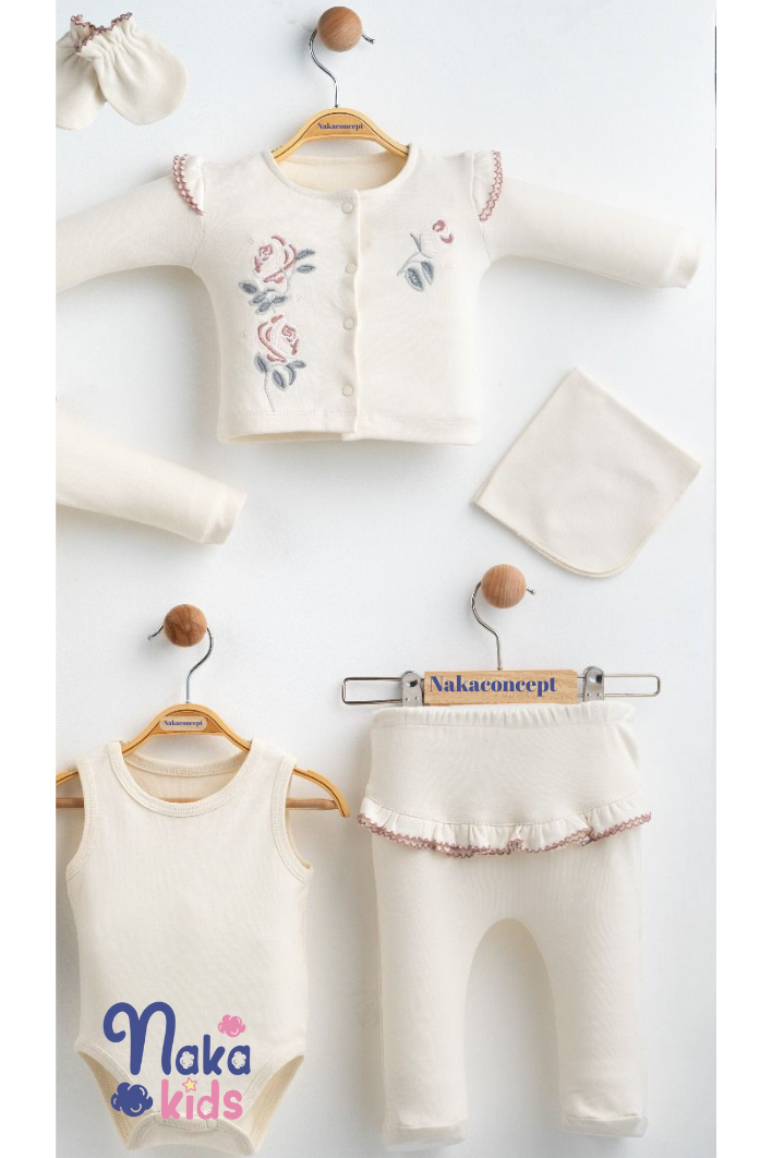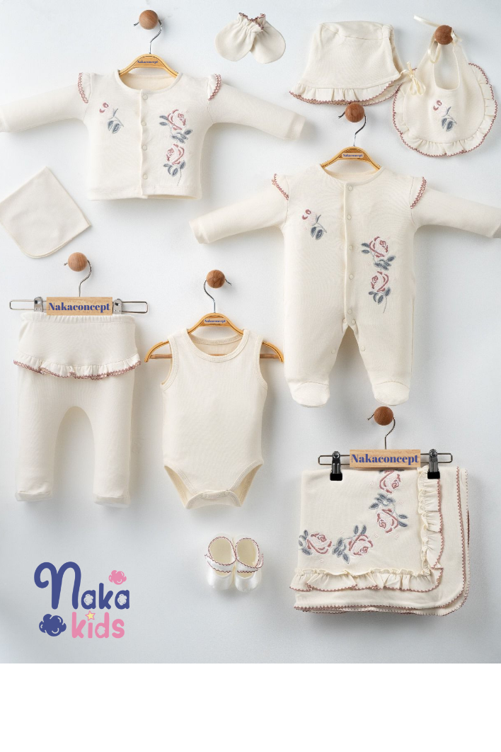Kız bebekler için özel olarak hazırlanmış 10 parçalık hastane çıkış seti, bebeğinizin ilk günlerini daha da anlamlı kılmak için zarafetle tasarlandı. %100 organik pamuktanüretilen bu set, bebeğinizin hassas cildine uyum sağlayarak sağlıklı ve konforlu bir kullanım sunar. Şık gül nakışlarıve zarif fırfır detaylarıile göz alıcı bir tasarıma sahiptir.