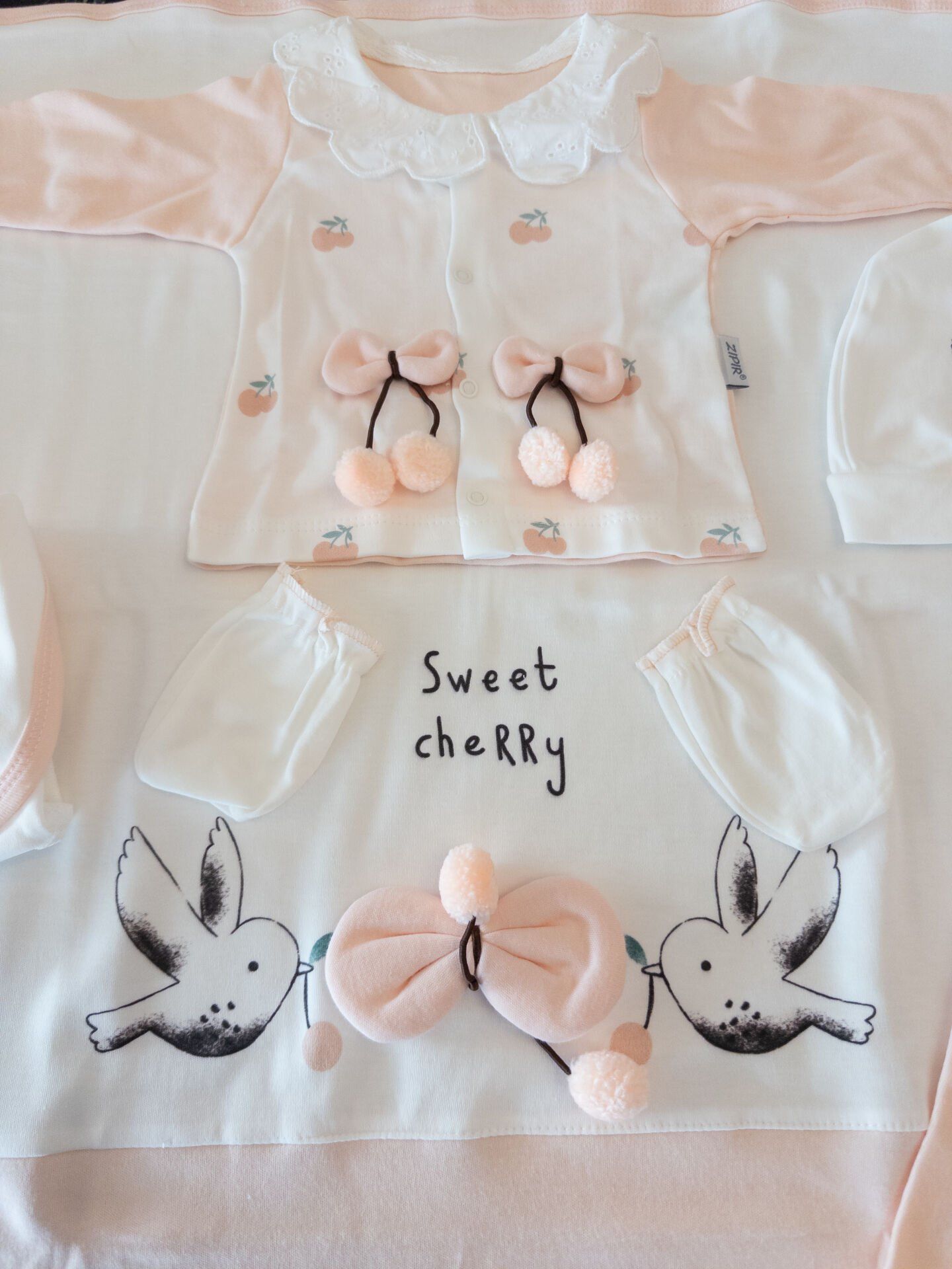 Bu sevimli hastane çıkış seti, ağzında kiraz taşıyan şirin kuş desenleri ve zarif fiyonk detaylarıyla süslenmiştir. Bebeğinizin ilk günlerine neşe ve şıklık katmak için mükemmel bir seçenek.