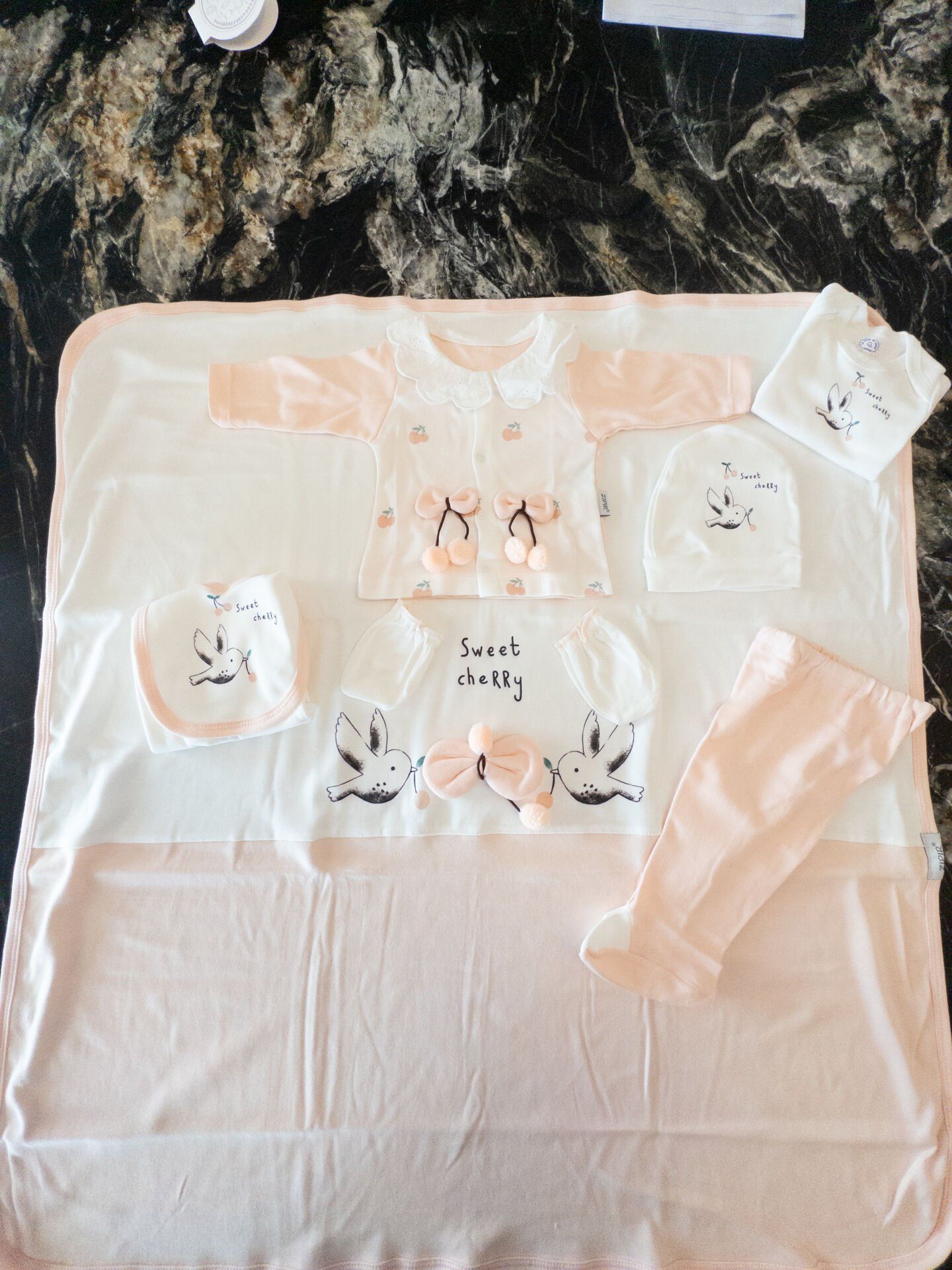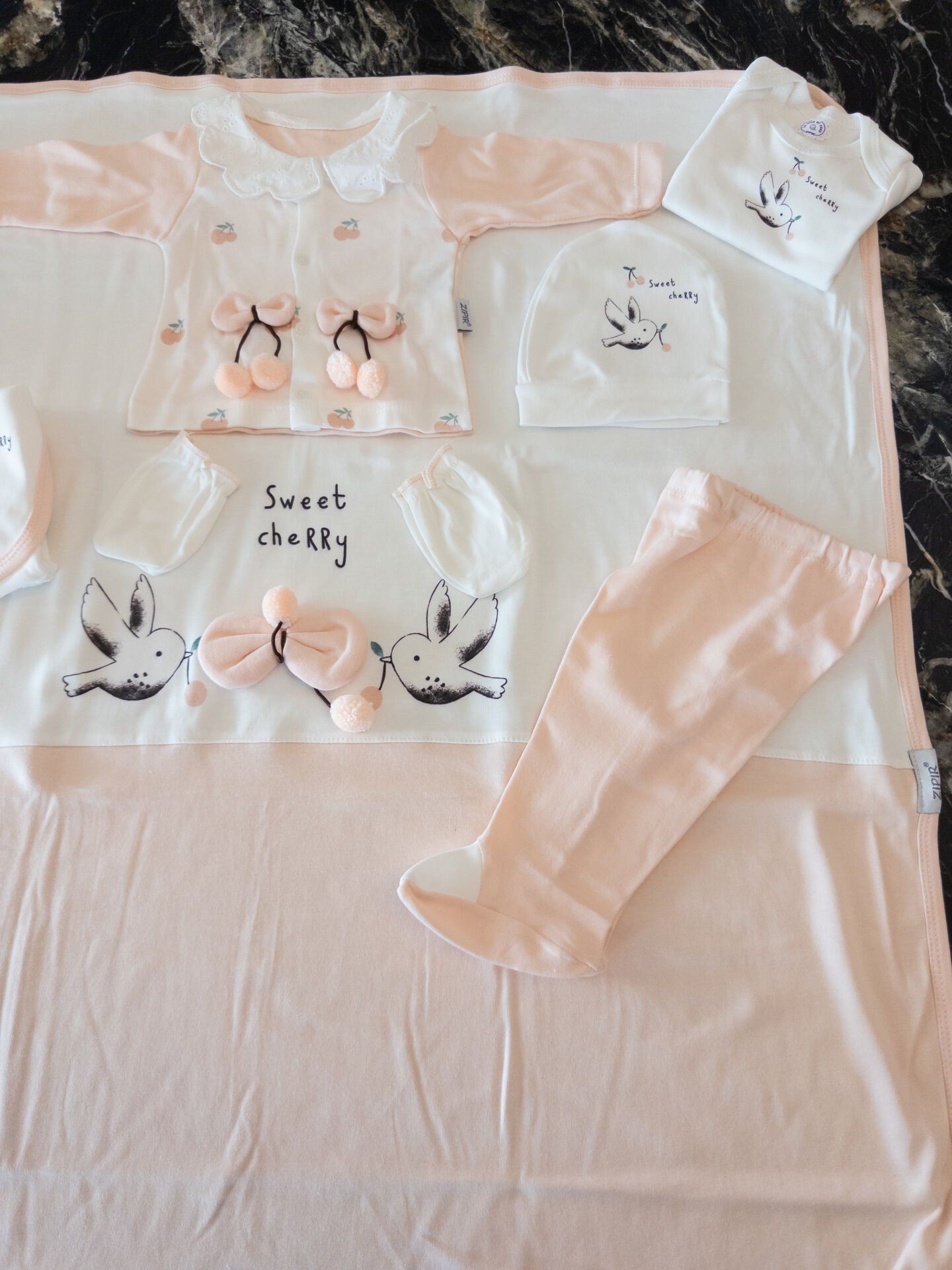 10 parçalık set; Battaniye,zıbın,iç zıbın,uzun kollu body,kısa kollu body,patikli pantolon,önlük,şapka,eldiven,el mendili