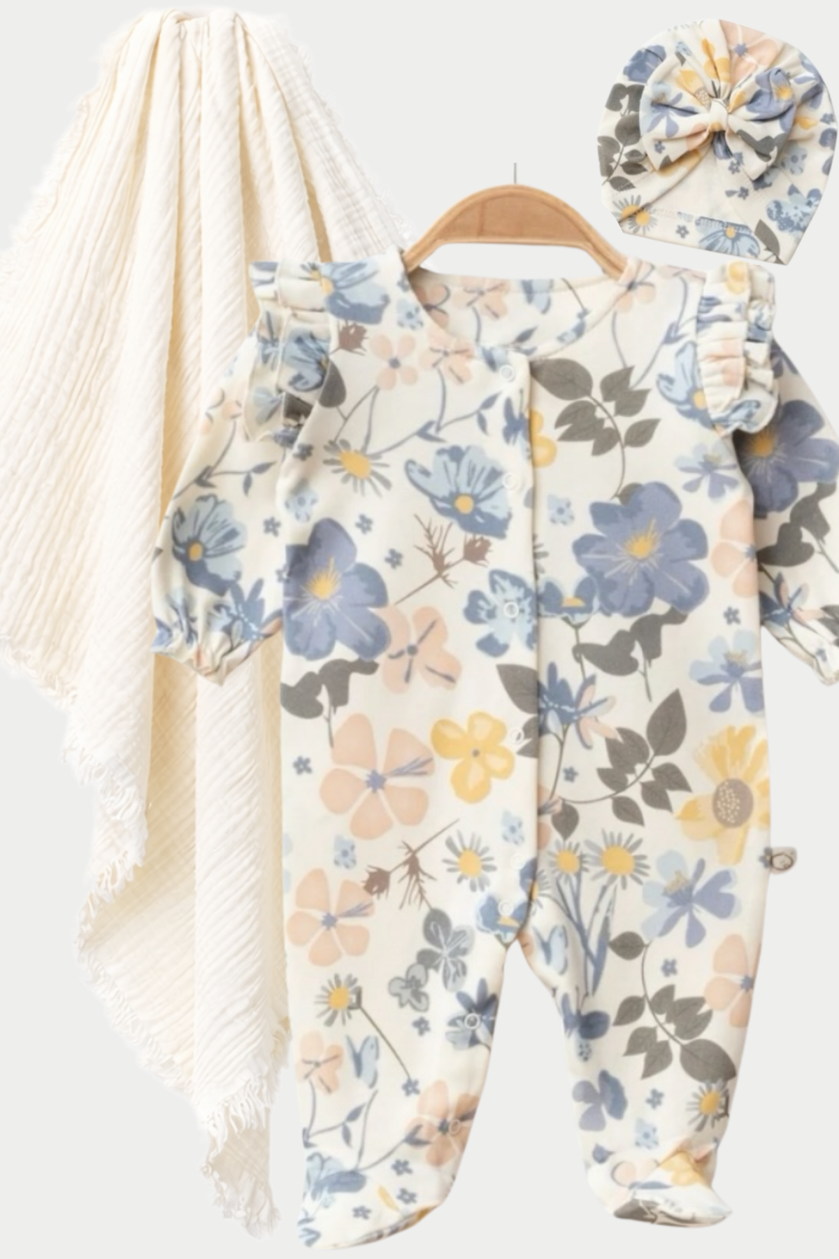Bebeğinizin ilk günleri için özel olarak hazırlanan yenidoğan bebek hastane çıkışı seti, yumuşak dokulu interlock pamuk tulumu ve nefes alabilen müslin battaniyesi ile konfor ve şıklığı bir arada sunar. Yenidoğan bebeklerin hassas cildi düşünülerek tasarlanan bu set, günlük kullanım ve hastane çıkışı için ideal bir seçimdir.