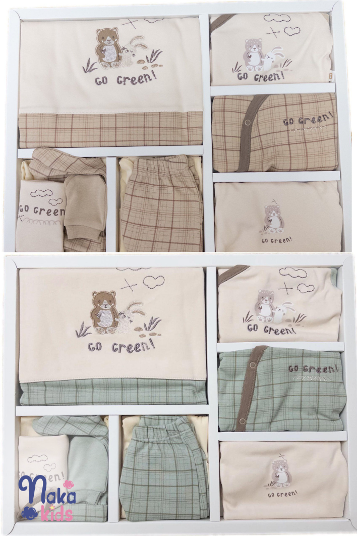 Doğanın taze ve huzur veren ruhunu bebeğinizin ilk günlerine taşıyan Green Haven, yeni doğanınıza doğal bir başlangıç sunuyor. %100 saf pamuktan üretilmiş bu 10 parça set, yeşilin farklı tonlarıyla süslenmiş doğa temalı desenlerle bezeli, bebeğinizin cildine nazikçe dokunarak onu gün boyu rahat tutar.