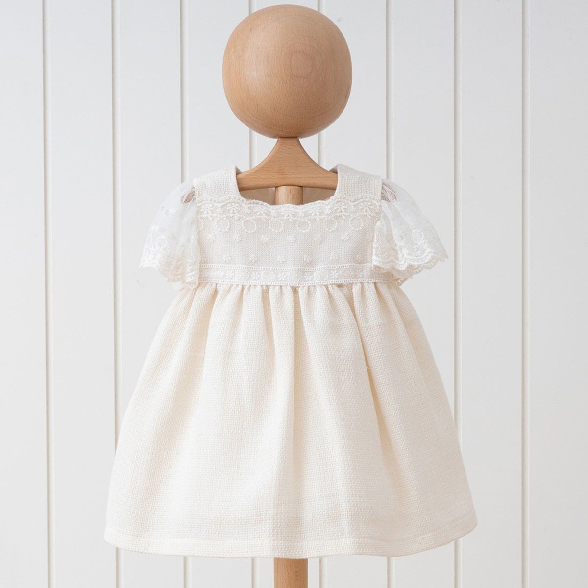 Bu göz alıcı elbise, ince dantel detaylarıyla bezeli yaka ve etek kısmı ile dikkat çeker. Dantel, elbisenin her yönüyle lüks ve sofistike bir hava katarken, hafif ve nefes alabilen pamuk kumaş, bebeğinizin cildini yumuşak bir şekilde sarar. Elbisenin arkasında bulunan düğmeler, kolay giydirme ve çıkarma imkanı sunar ve pratikliği artırır.