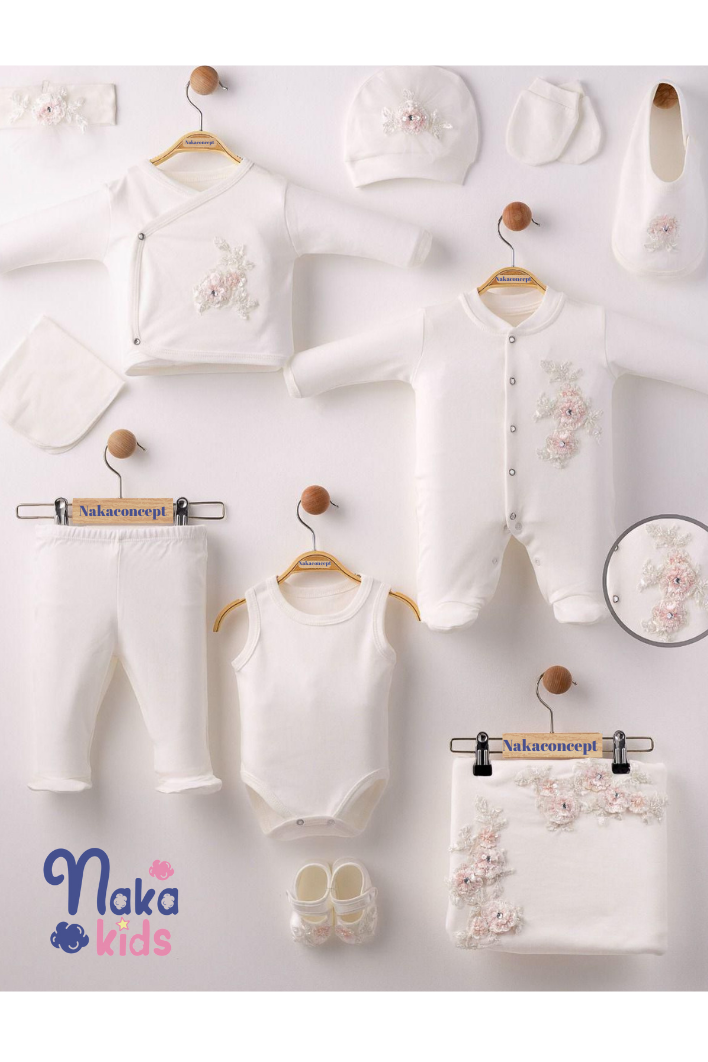 Kız bebekler için özel olarak tasarlanmış 10 parçalık dantelli hastane çıkış seti, bebeğinizin ilk anlarını unutulmaz kılmak için şıklık ve zarafeti bir araya getiriyor. %100 organik pamuktanüretilen bu set, bebeğinizin hassas cildine dost yapısıyla sağlıklı ve konforlu bir kullanım sunar. İnce detaylarla işlenmiş dantel süslemelerisayesinde klasik ve zarif bir görünüm elde edilmiştir.