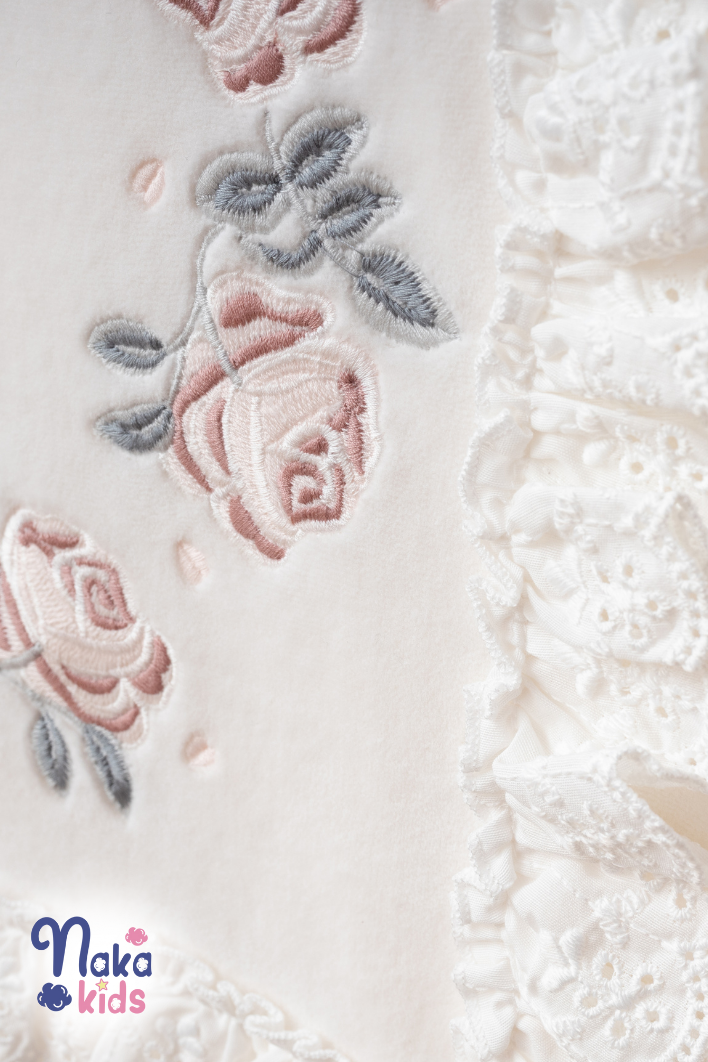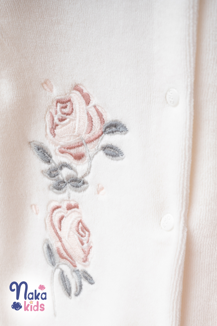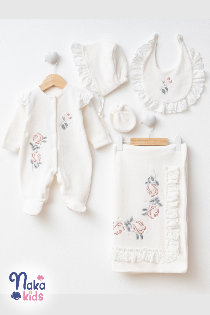 Yumuşak dokulu kadife kumaşı sayesinde bebeğinizin cildine nazik bir dokunuş sağlar ve konforlu bir kullanım sunar. - Çiçekli desenleriyle göz alıcı bir görünüm kazandırır, bebeğinizin şıklığını ön plana çıkarır. - 5 parçadan oluşan set, hastane çıkışında ihtiyaç duyulan temel ürünleri tek pakette toplar. - Paker içeriğinde battaniye, tulum, eldiven, şapka ve önlük mevcuttur - 56–62 cm boyundaki, 0–3 aylık bebekler için uygundur. - Battaniye ebatı 85*85 cm dir. – Battaniye ve önlük çift kat kadife kumaştan oluşmaktadır. - Bebeklerin hassas cildi düşünülerek tasarlanmıştır; yumuşak dokusuyla bebeğinizin rahat etmesini sağlar. - Ürün, özel tasarım kutusunda özenle paketlenerek gönderilir; zarif görünümüyle hediye seçimlerinde de şık ve anlamlı bir tercihtir.