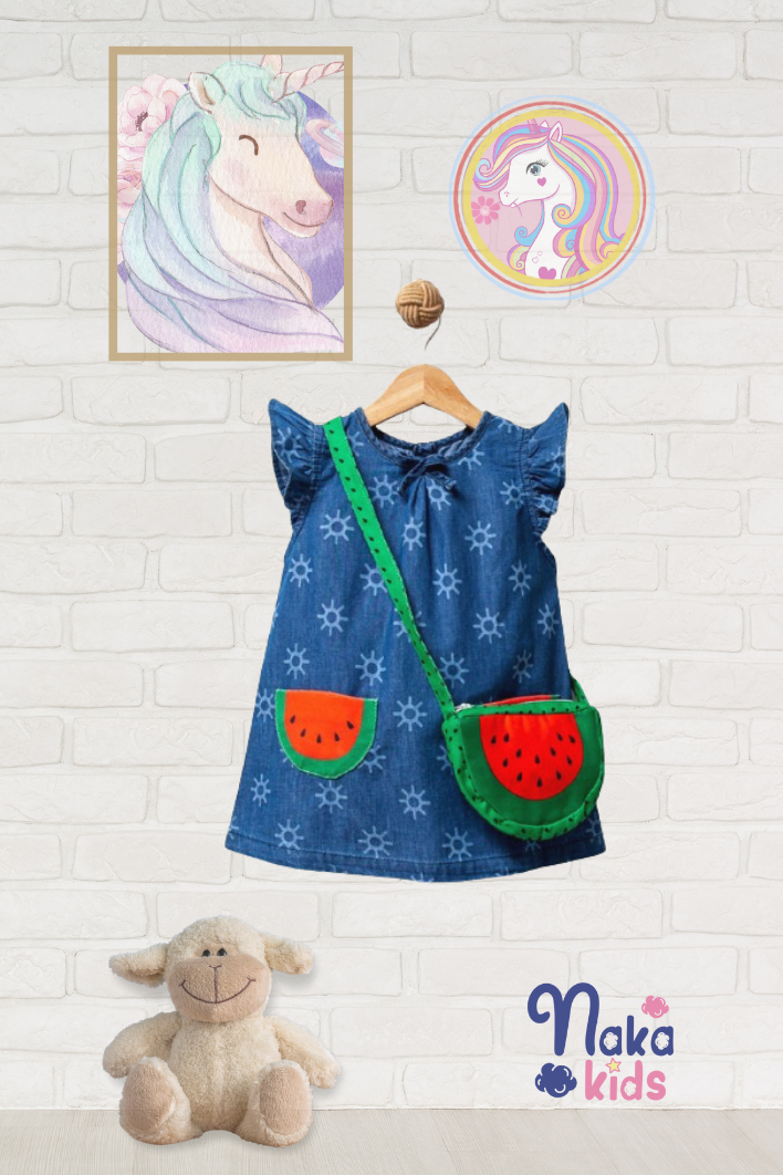 Elbisenin en sevimli yönlerinden biri, ön tarafında yer alan, karpuz dilimleri şeklinde tasarlanmış ceplerdir. Bu renkli ve eğlenceli detaylar, elbisenin sade mavisine mükemmel bir kontrast oluşturarak, göz alıcı bir stil yaratır. Karpuz temalı yan çanta ise, bu şık görünüme eğlenceli ve fonksiyonel bir boyut ekler. Bebeğinizin küçük eşyalarını yanında taşıması için ideal olan bu çanta, yaz günlerinin vazgeçilmez aksesuarıdır.