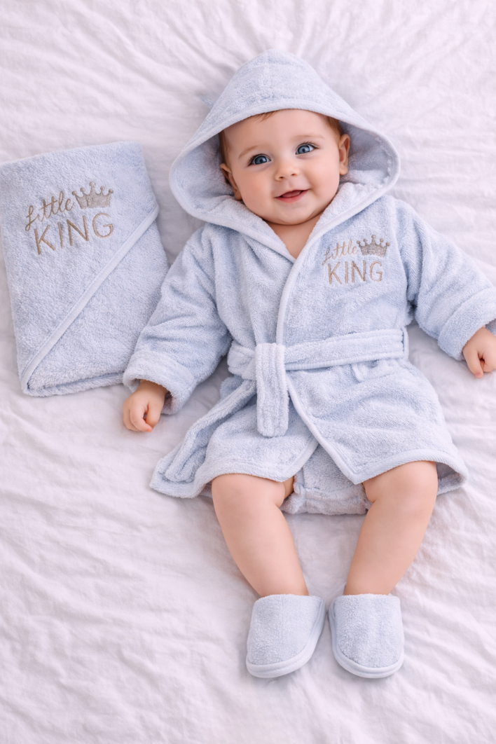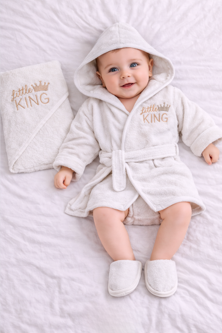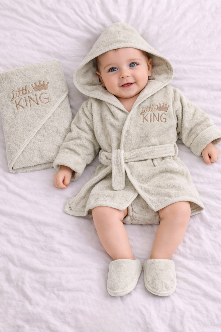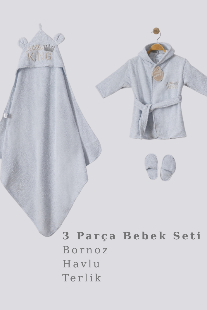 • 3 Parça Set: Kapüşonlu bornoz, kundaklı havlu, terlik