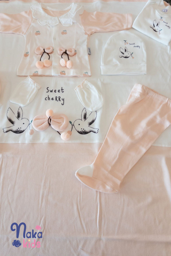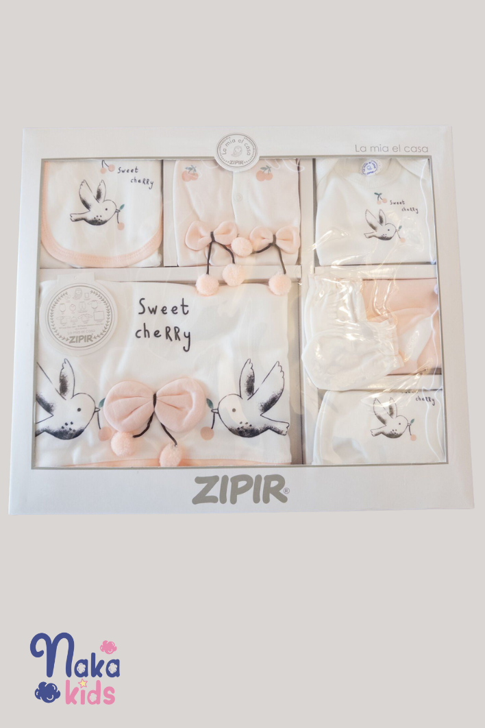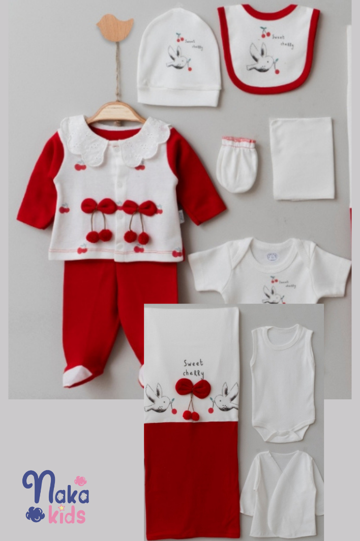 Bu sevimli hastane çıkış seti, ağzında kiraz taşıyan şirin kuş desenleri ve zarif fiyonk detaylarıyla süslenmiştir. Bebeğinizin ilk günlerine neşe ve şıklık katmak için mükemmel bir seçenek.