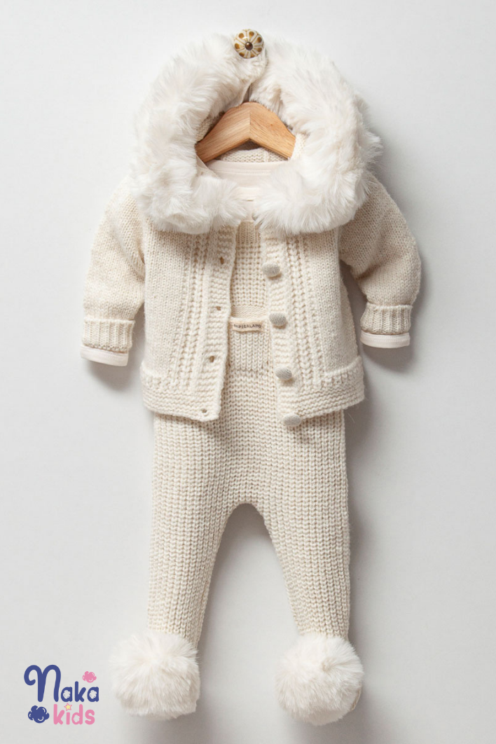 Kışın soğuk günleri için tasarlanmış bu şık ve konforlu set, bebeğinizin sıcacık kalmasını sağlar. Kış Masalı Triko Seti, uzun kollu, yumuşacık penye body ve koruyucu triko ile bebeğinizi en iyi şekilde sarar. Ürün, çıkarılabilir kürklü triko ceket ve ponpon detaylı salopet ile tamamlanmıştır. Salopetin ponponları çıkarılabilir, böylece daha rahat bir kullanım sunar. Triko ceket, bebeğinizi soğuktan korurken, triko salopet ise rahat hareket edebilmesini sağlar. Yumuşak dokusu ve şık tasarımıyla bebeğinizin cildini nazikçe sarar. Kış boyunca tarzdan ödün vermek istemeyen anne babalar için mükemmel bir seçimdir.