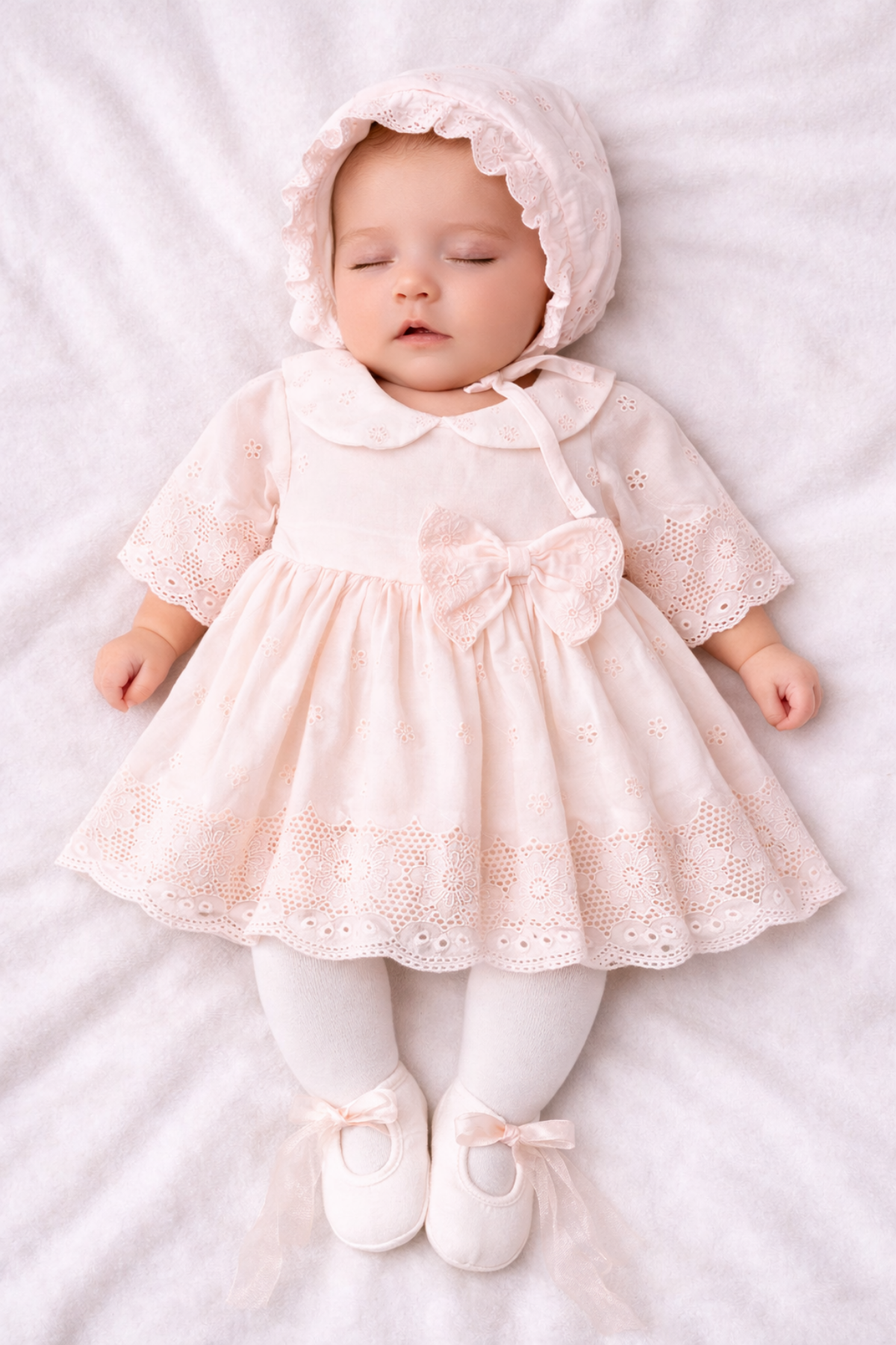 · Elbise ile aynı kumaştan çene altından bağlamalı bebek şapkası