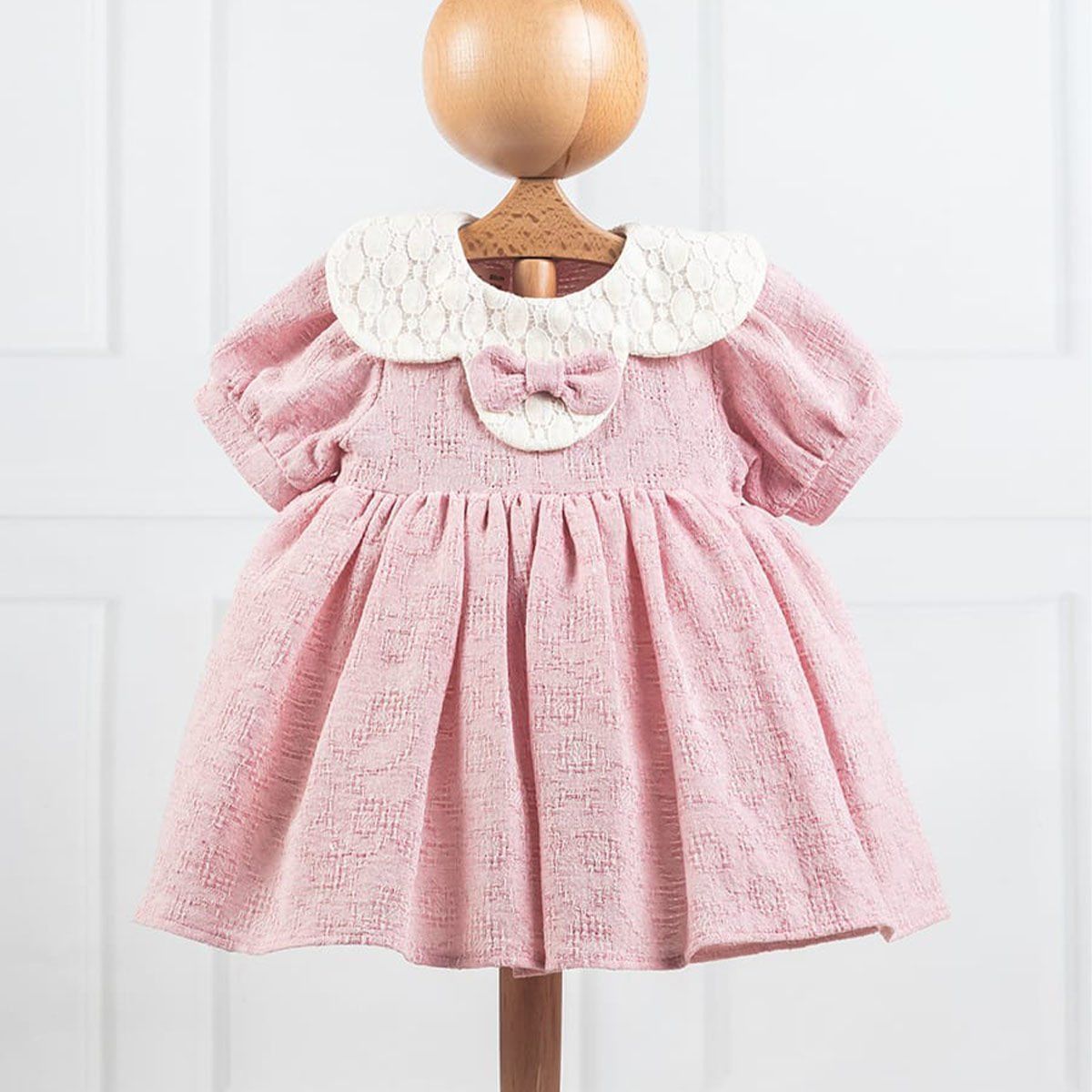 Bu sevimli kız bebek elbisesi, miniklerin gardıroplarında olmazsa olmaz bir parça. %100 pamuk kumaştan üretilmiştir, bu nedenle bebeklerin hassas cildine nazik davranır ve gün boyu konfor sağlar. Elbisenin öne çıkan özellikleri arasında zarif bir papatya yakası ve ön kısmında yer alan büyüleyici bir fiyonk bulunmaktadır. Bu detaylar elbiseye hem klasik hem de şık bir hava katıyor.