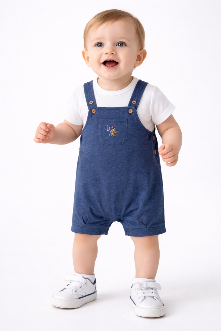 Bebeğinizin gün boyu konforla hareket edebilmesi için tasarlanmış, şık ve zamansız bir salopet şort takımı.