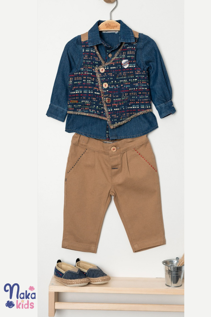 Minik beyler için özel olarak tasarlanan Tarz Sahibi 4’lü Takım, şıklığı ve rahatlığı bir araya getiriyor. Kot gömlek, klasik ve cool bir duruş sunarken, üzerine eklenen şık yelek ile kombin tamamlanıyor. Dıştan dikiş detaylı pantolon, modern tarzıyla fark yaratırken, uyumlu ayakkabı ise rahat ve şık bir adım sağlıyor. Özel günlerden günlük kombinlere kadar her an bebeğinize tarz ve konfor sunan bu set, stil sahibi minik beyler için vazgeçilmez olacak!