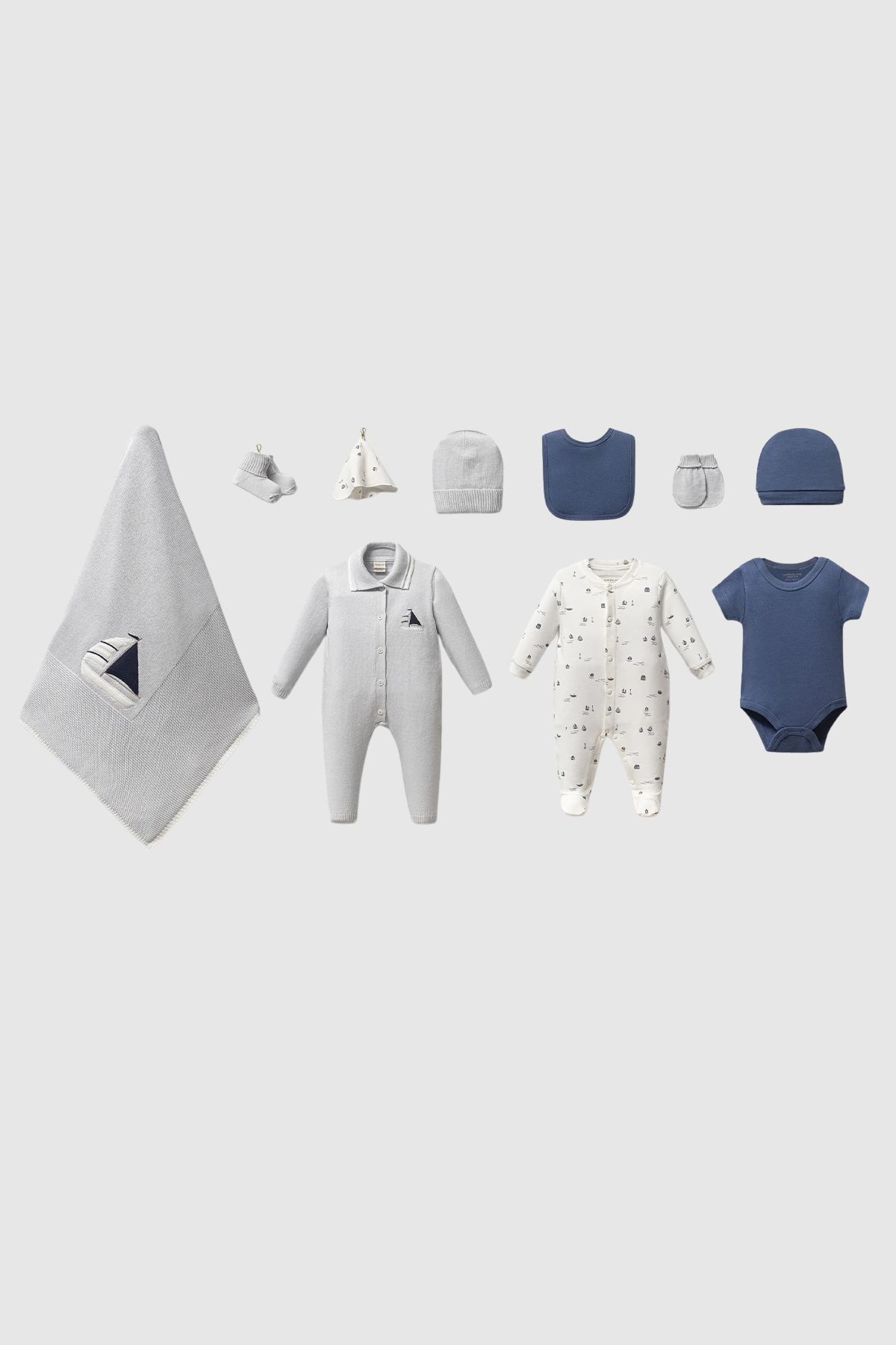 Yenidoğan erkek bebekler için özel tasarlanmış Erkek Bebek Hastane Çıkış Seti, triko ve pamuklu interlock kumaşların birleştiği 10 parça premium hastane çıkış seti.