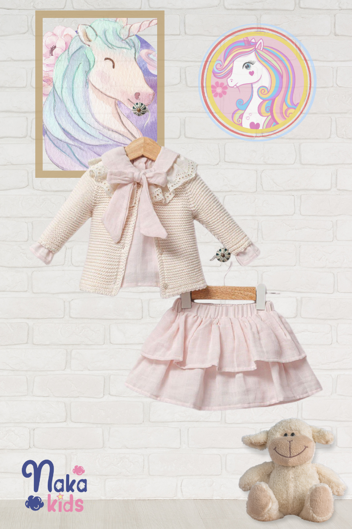 Bu ürünümüz, minik prenseslerin zarafetini ön plana çıkarmak için özenle tasarlanmıştır. Setimiz, bebeklerin hassas cildi düşünülerek %100 doğal pamuktan üretilmiş bir triko hırka ve şık bir fırfırlı etekten oluşmaktadır. Hırkamız, yumuşacık dokusu ile bebeğinizin gün boyu rahat etmesini sağlarken, fırfırlı eteğiyle de stil sahibi bir görünüm kazandırır. İki parçadan oluşan bu set, günlük kullanım için idealdir ve özel günlerde de kızınızı en şık şekilde temsil eder.