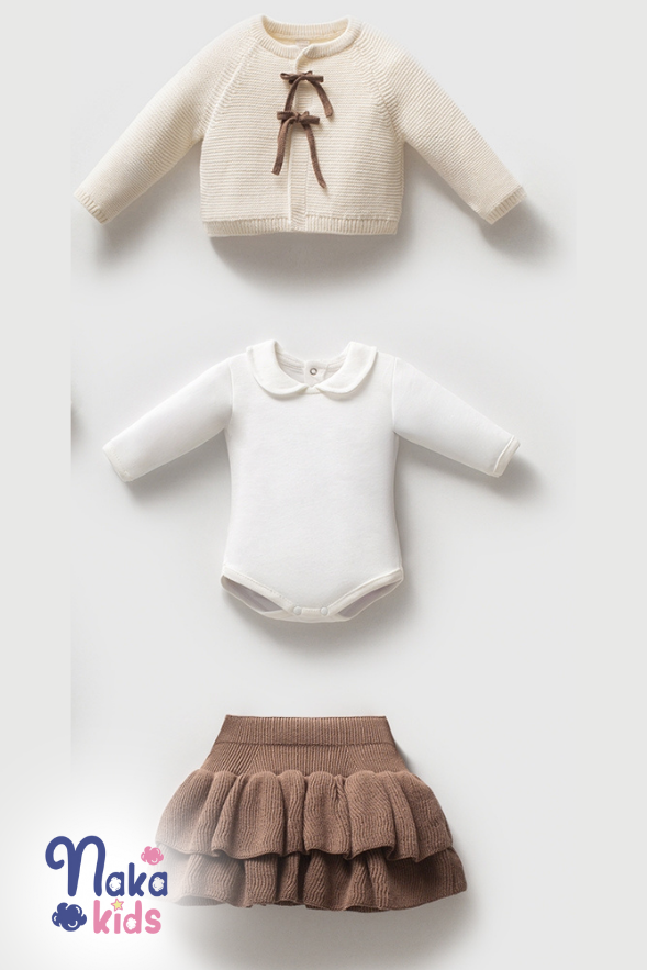 Takımın iç parçası; alttan çıtçıtlı, uzun kollu, beyaz renkte klasik bebe yakalı body. Üzerine giyilen ekru triko ceket, önden iki bağcık detayıyla tamamlanıyor. Bağlama ipi, eteğin rengiyle uyumlu düşünülerek tasarlandı.