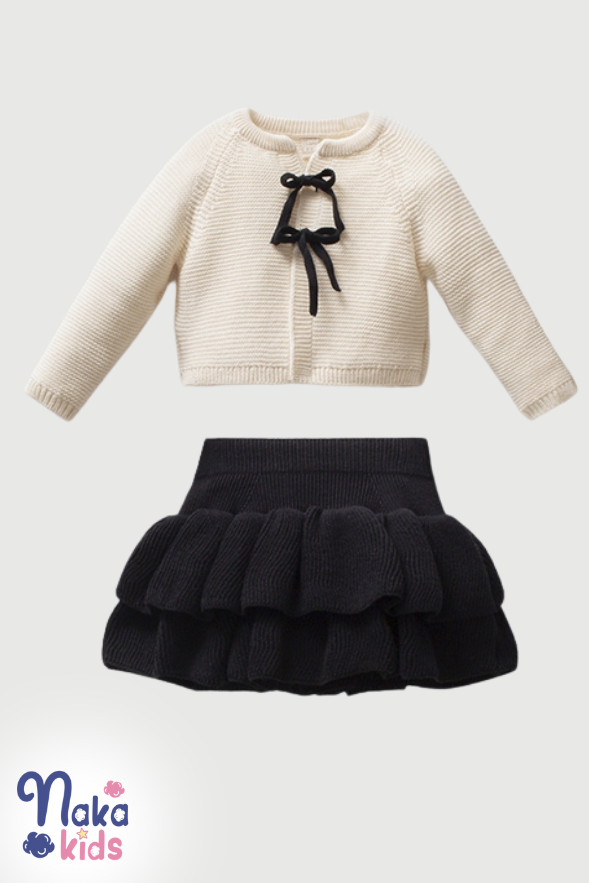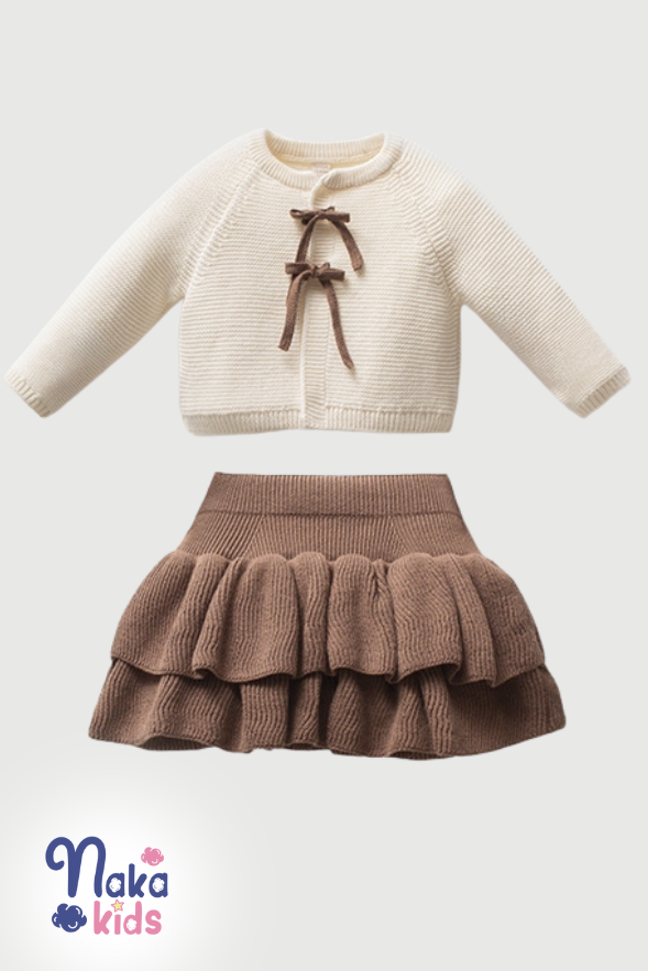 Takımı tamamlayan triko etek, lastikli beli ve çift kat fırfırıyla miniklere hareketli bir görünüm kazandırıyor.