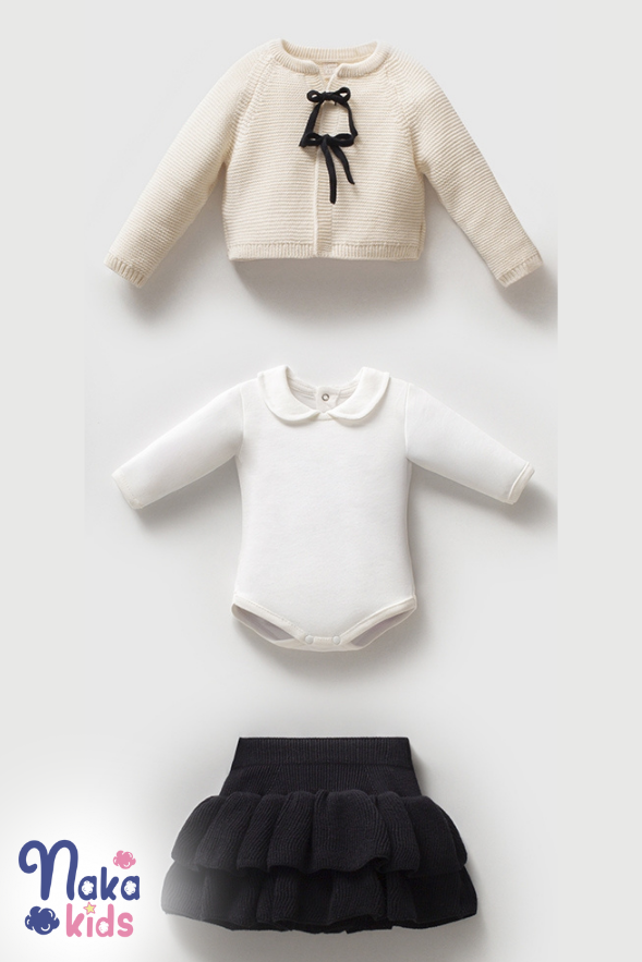 Takımın iç parçası; alttan çıtçıtlı, uzun kollu, beyaz renkte klasik bebe yakalı body. Üzerine giyilen ekru triko ceket, önden iki bağcık detayıyla tamamlanıyor. Bağlama ipi, eteğin rengiyle uyumlu düşünülerek tasarlandı.