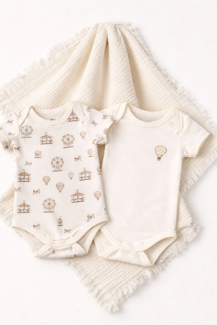 Hastane çıkışı seti içerisinde 2 adet kısa kollu zıbın (1 adet sade, 1 adet desenli) ve 1 adet müslin battaniye bulunmaktadır.
