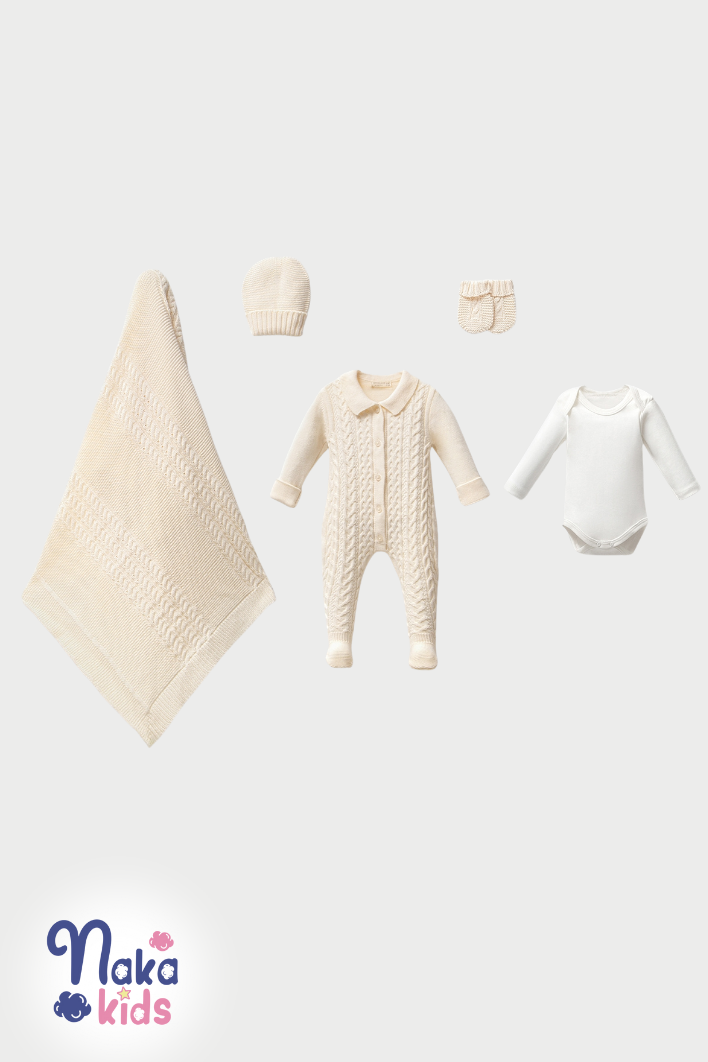 Bebeğinizin ilk günlerinde hem şıklık hem de konfor sunan bu özel set, zarif örgü deseni ve yumuşak pamuklu dokusuyla öne çıkar. Yenidoğan bebeklerin hassas cildine dost yapısı sayesinde terletmez, tahriş etmez ve dört mevsim rahatlıkla kullanılabilir.