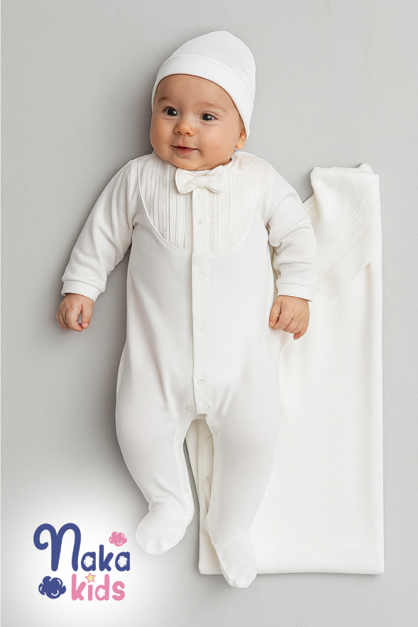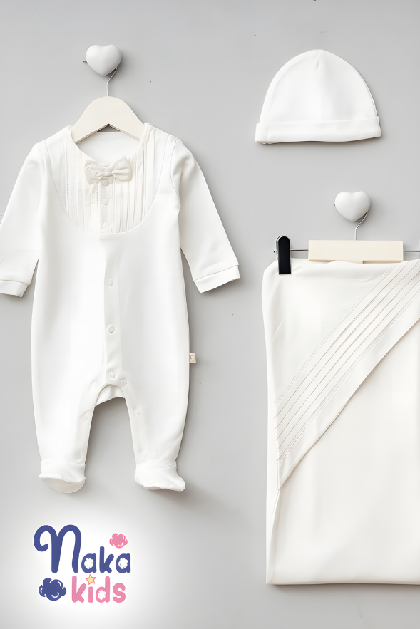 Bu özel 3 parçalık erkek bebek seti, %100 pamuk interlok kumaşıyla yumuşacık dokunuş sunar. Göğsündeki papyon detayıyla minik beyefendiye ilk stilini kazandırır.