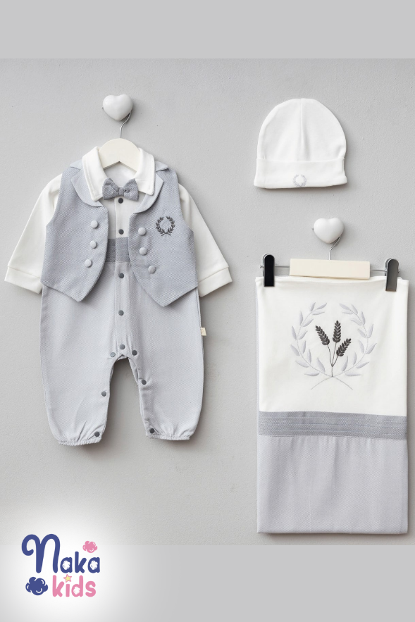 Şık 3 Parça Set: Tulum, papyonlu yelek görünümlü üst ve uyumlu şapka ile bebeğinizin ilk günlerine zarafet katar.