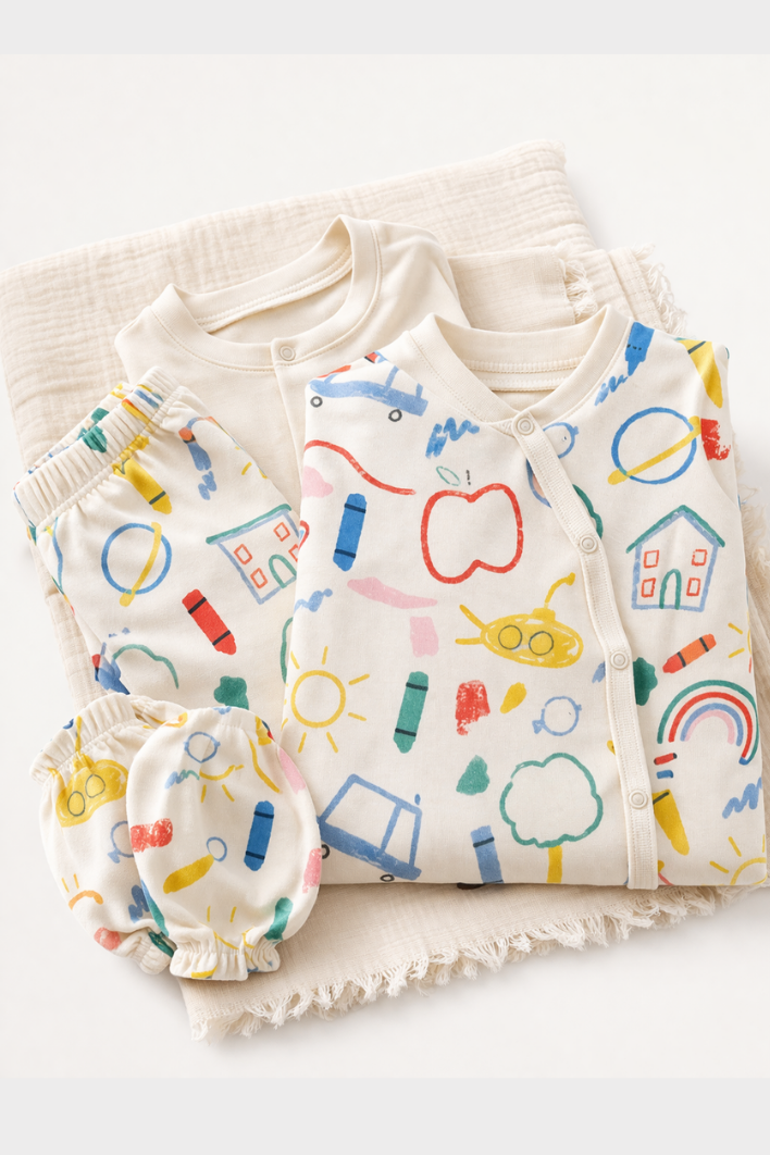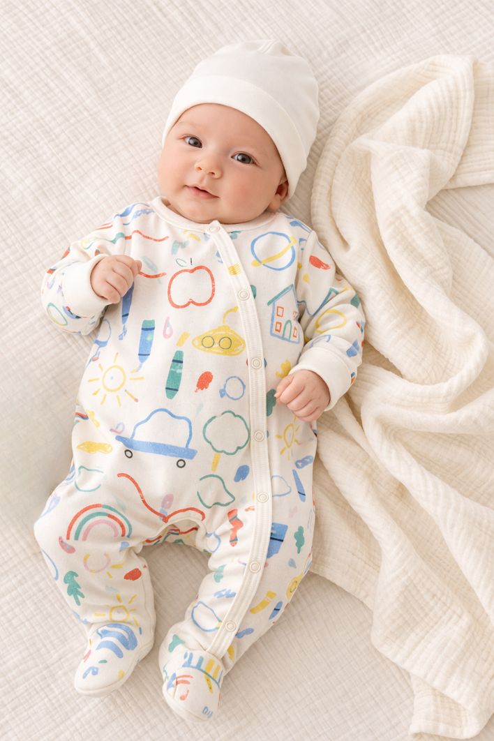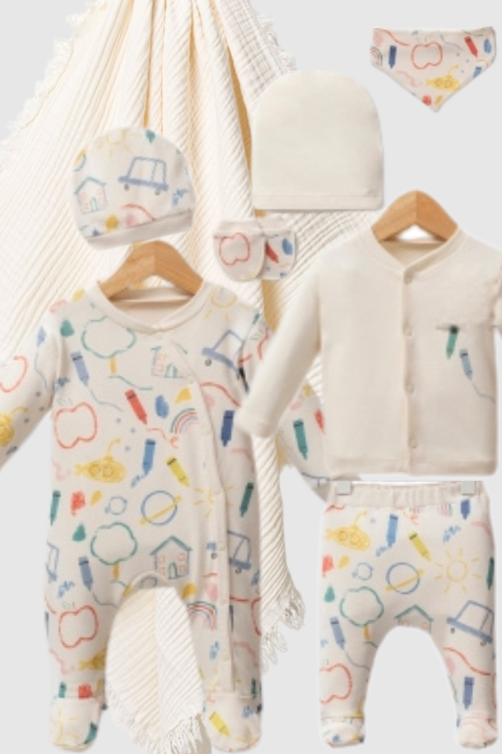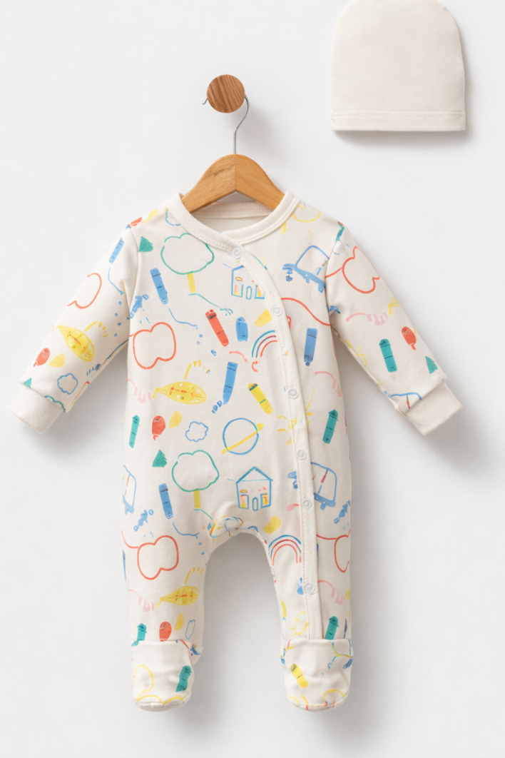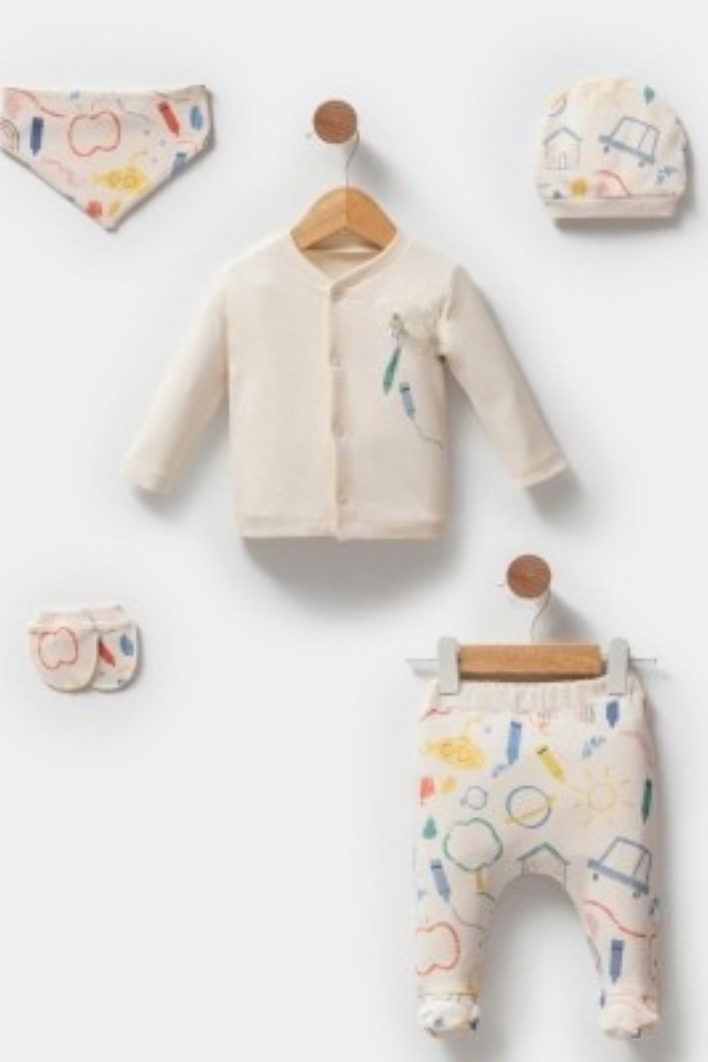 Pastel tonlarda çizim desenleriyle tasarlanmış, yenidoğan bebekler için yumuşak ve konforlu hastane çıkış seti.