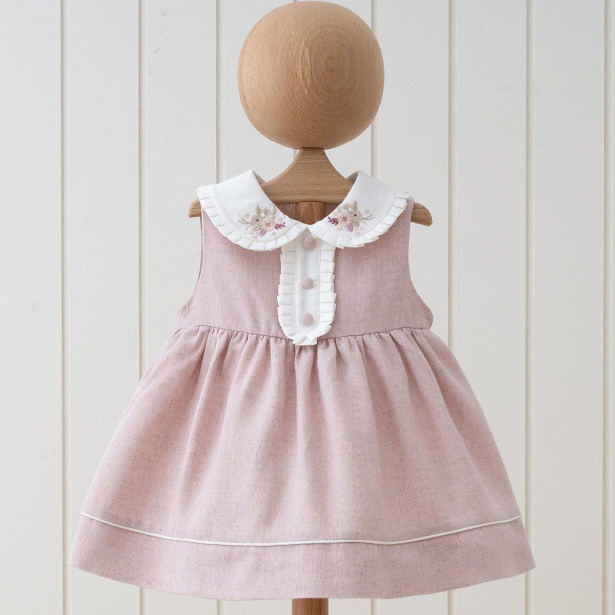 Bu kolsuz, keten dokulu elbise, kız bebeklerinize hem rahatlık hem de şıklık sunar. %100 pamuk kumaşı ile bebeğinizin cildine dosttur ve çiçek işlemeli yakası ile göz alıcı bir görünüm sağlar. Bebeklerinizin gardırobuna zarafet katacak bu elbise, her anne babanın favorisi olacak.