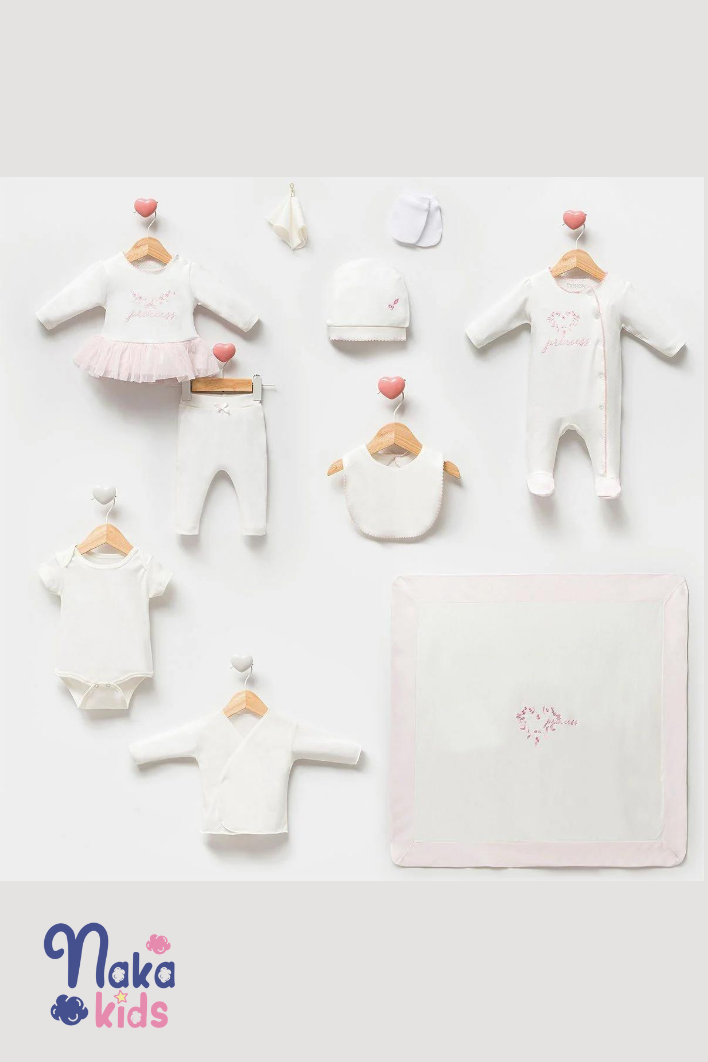 - Set İçeriği: 10 parçalık bu özel set, her yeni ebeveynin ihtiyaç duyacağı temel ürünleri içerir: bir adet zıbın, bir adet pantolon, bir adet şapka, bir adet eldiven, bir adet battaniye, 1 adet elbise, ve bir adet önlük. Her biri, bebeğinizin ihtiyaçlarını düşünerek özel olarak tasarlanmıştır.