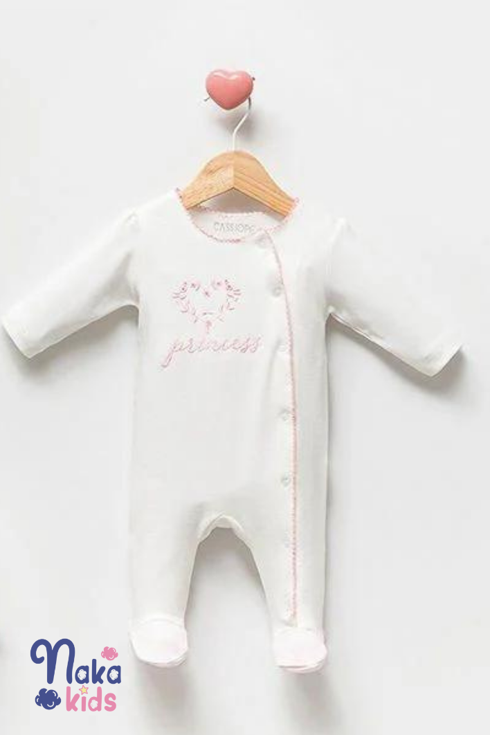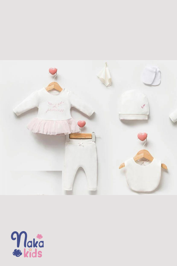 - Setimiz, asil ve sakin bir görünüm sunan ekru rengin sıcak tonları ile tasarlanmıştır. Üzerindeki "Princess" yazısı ve etrafını saran çiçeklerden oluşan kalp işlemeleri, zarif detaylarla doludur. Bu set, bebeğinizin doğal güzelliğini ve masumiyetini ön plana çıkaracak.