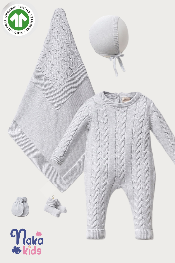 • 5 Parça Zarif Set: Set içerisinde saç örgü desenli tulum, şapka, eldiven, battaniye ve önlük bulunmaktadır; bebeğinizin hastane çıkışında ihtiyaç duyacağı her şey bir arada.