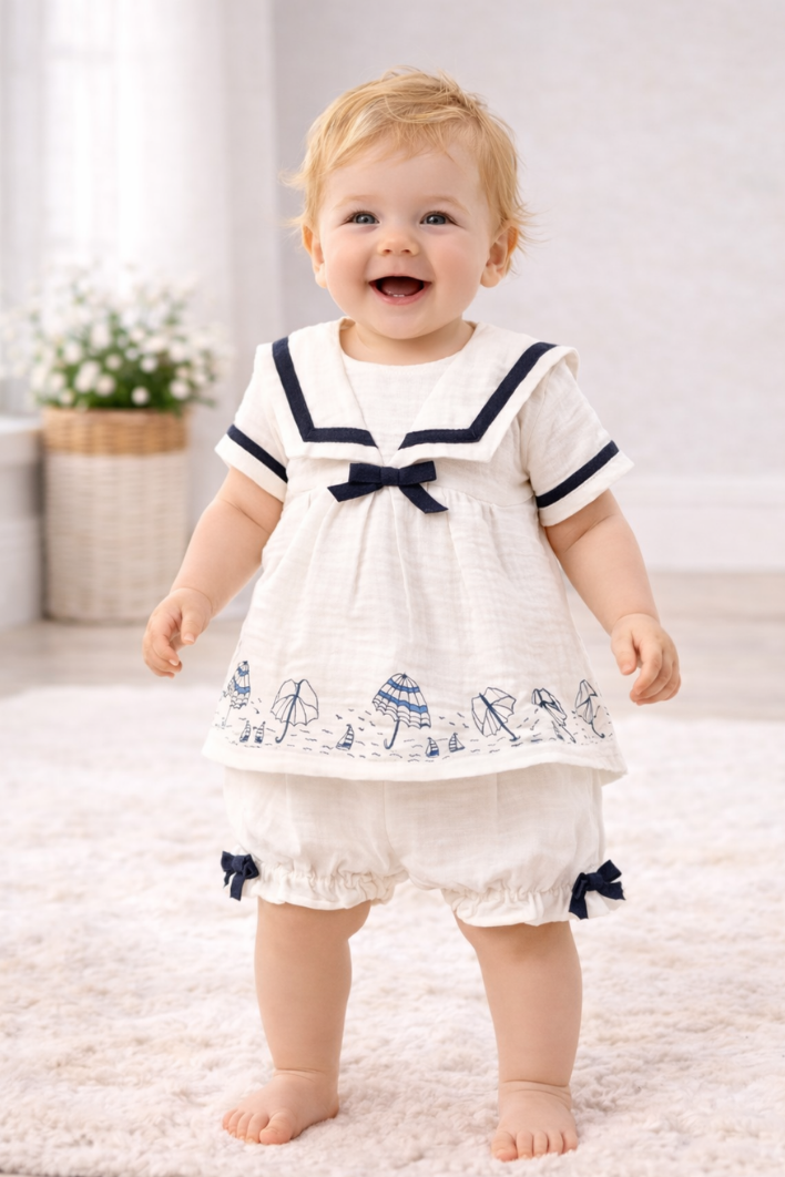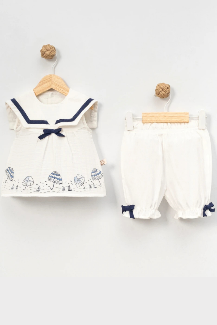 Yaz aylarında ferah ve şık bir görünüm sunan denizci konseptli kız bebek takımı.