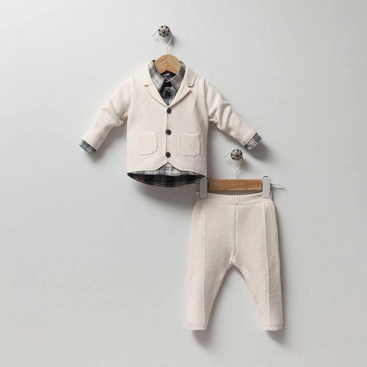Krem renginin yumuşak tonuyla dikkat çeken bu set; bir adet el örgüsü ceket, bir adet konforlu örgü pantolon ve bir adet karakteristik oduncu gömleğinden oluşur. Her bir parça, bebeklerin gün boyu rahat etmesini sağlamak için özenle hazırlanmıştır. Örgü ceket ve pantolon, soğuk günlerde sıcak tutarken, oduncu gömleği ise zarif bir dokunuş katıyor.
