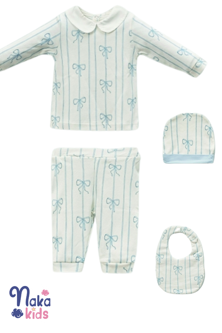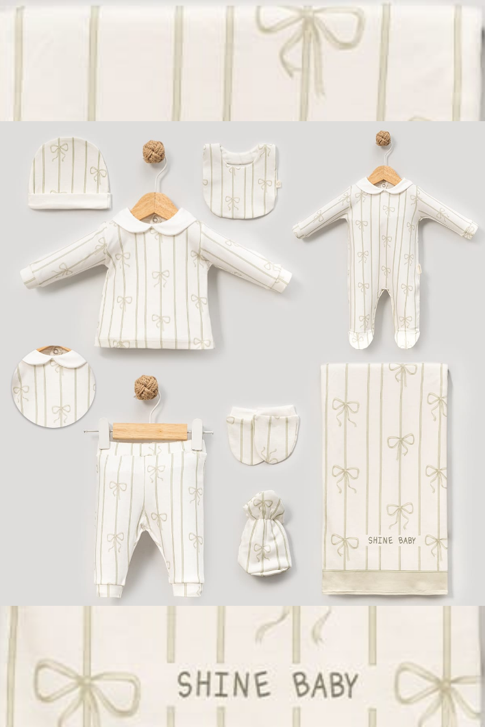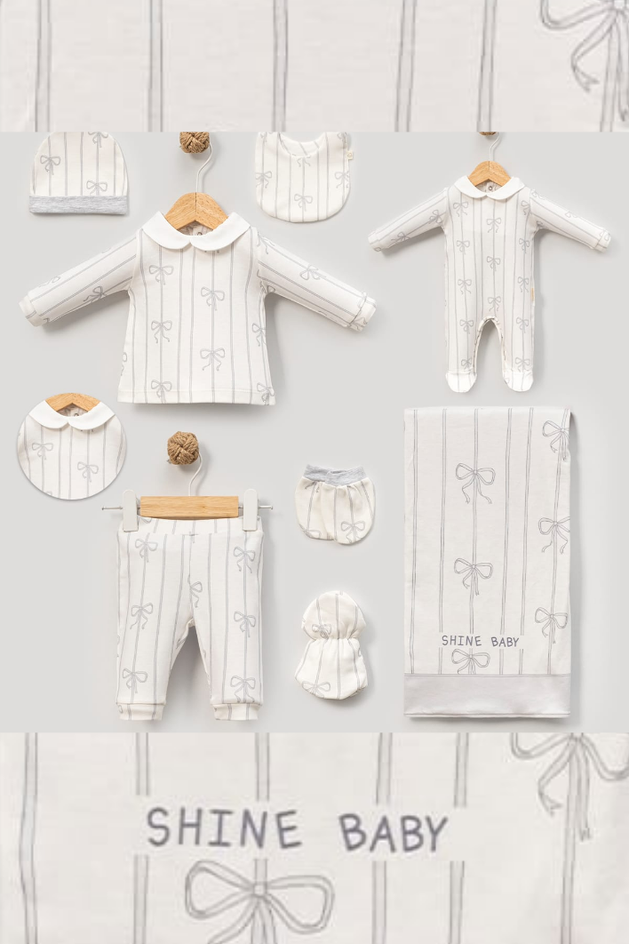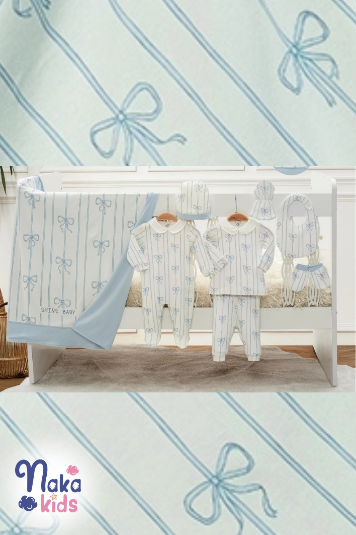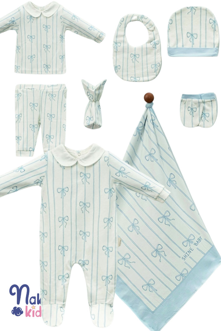 Mavi fiyonk detayları ve "Shine Baby" yazısıyla tasarlanmış bu özel set, bebeğinizin dünyaya ilk adımında ihtiyaç duyacağı tüm parçaları bir araya getirir. Zarif ve şık tasarımıyla hem günlük kullanım hem de hediye alternatifi olarak idealdir.
