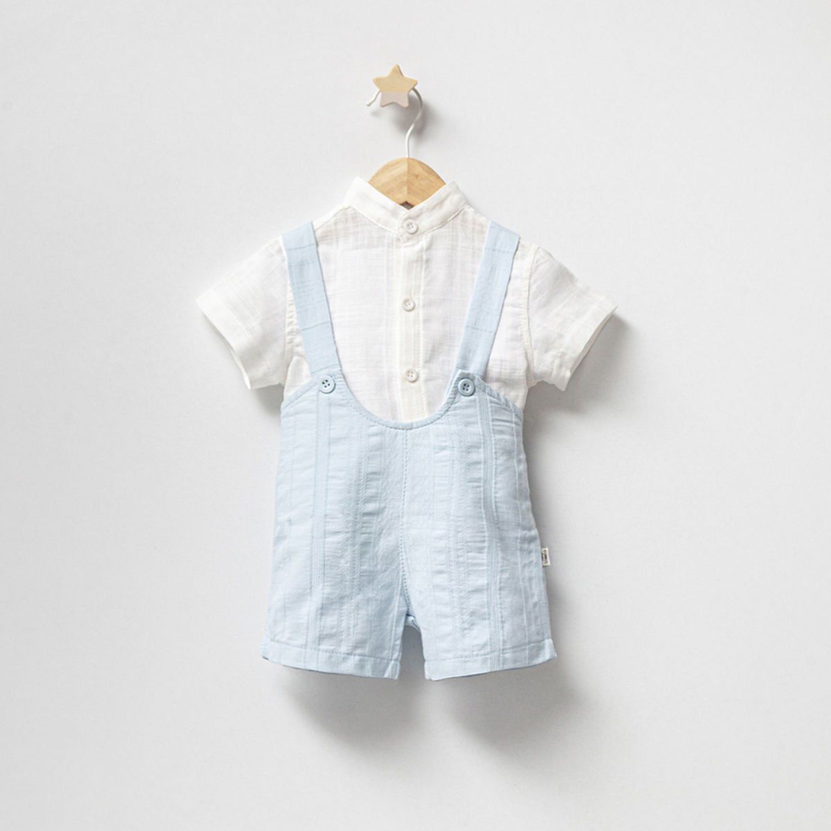 Set, yaz ayları için mükemmel olan hafif ve rahat bir kısa kollu gömlek ve eşleşen bir tulumdan oluşur. Gömlek, şıklığı artıran düzgün bir yaka ve pratik ön düğmeler ile tasarlanmıştır; tulum ise, kolay giydirip çıkarmayı sağlayan düğmeli bir alt kısmı ile bebeğinizin rahat etmesini sağlar.