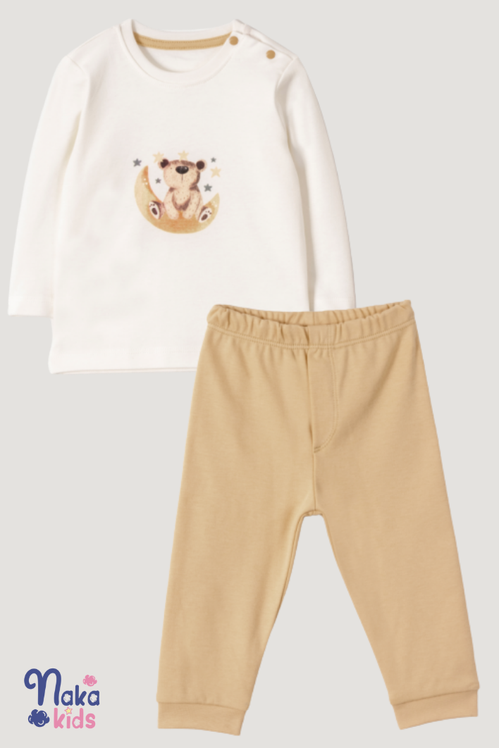 - Sevimli Ayıcık Detayları: Pijamanın üst kısmında şirin bir ayıcık baskısı, alt kısmında ise ayıcık pati desenleri bulunur. Miniklerin sevimliliğini vurgulayan tasarım detayları ile özel bir görünüm sunar.